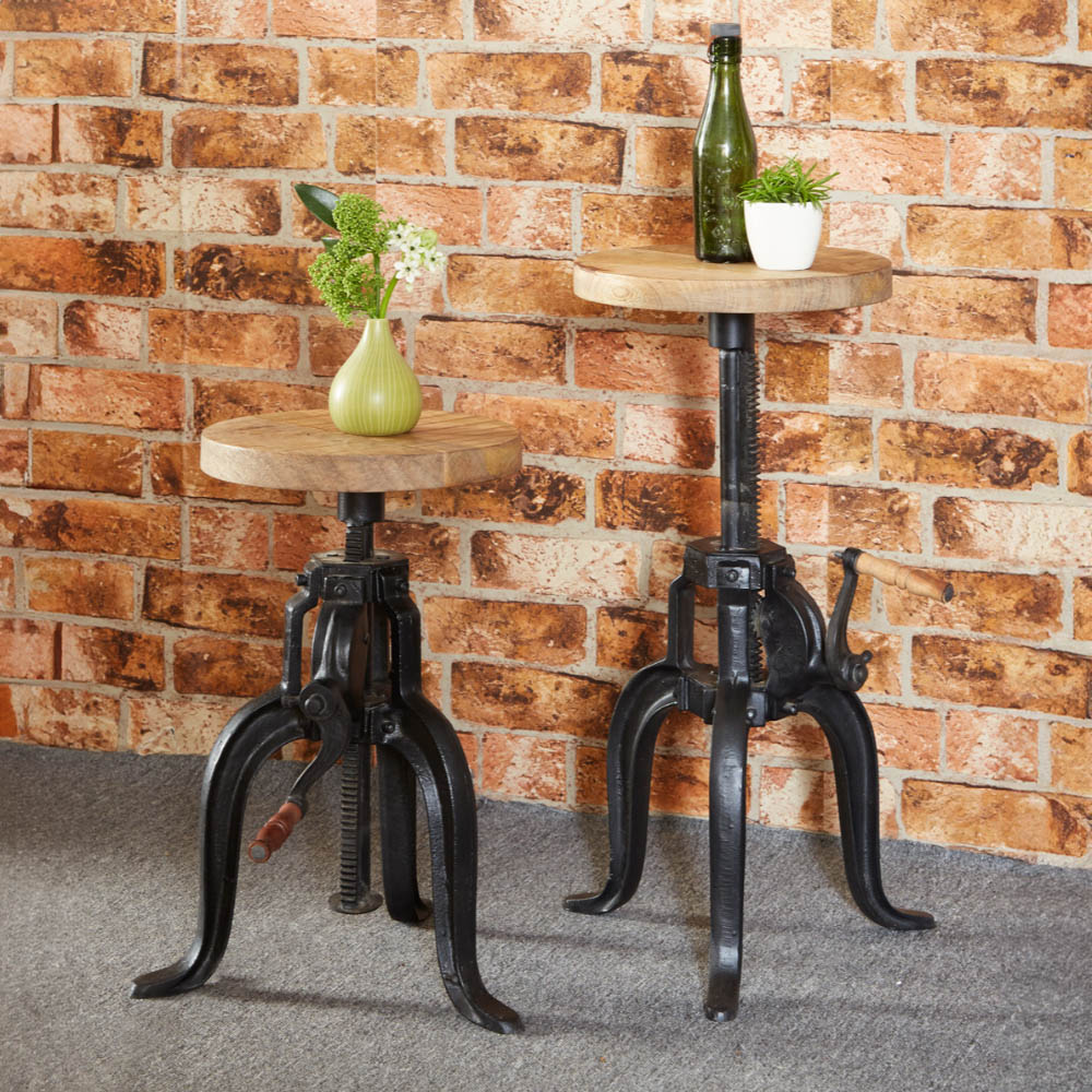 Industrial Crank Table featuring wood and metal and adjustable height. The light-grain hardwood is left in its Natural state and colour with natural variations and slight cracking with a banded iron edge.