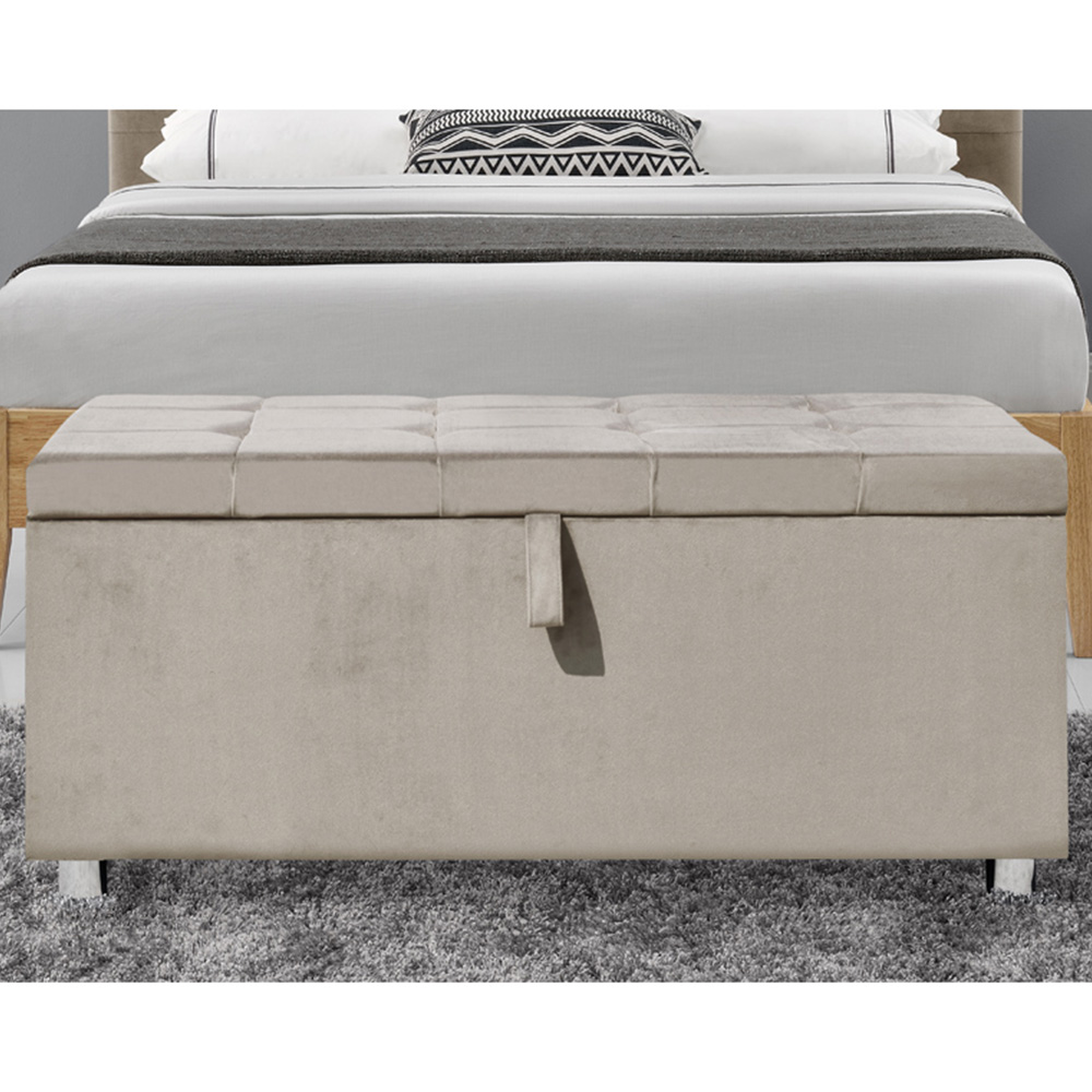 Uplift the look in your bedroom with the Brooklyn double stylish bed beautifully upholstered in cream plush velvet. It features a unique weaved effect padded headboard. It is made from a solid wooden frame and has a sprung slatted base to give support to the mattress and give you a fully supportive and comfortable night's sleep. The ottoman aspect of this bed frame is operated using a gas lift mechanism that lifts the mattress to reveal ample storage space. This bed frame is accompanied by 2 stunning upholstered bedside tables and a blanket box