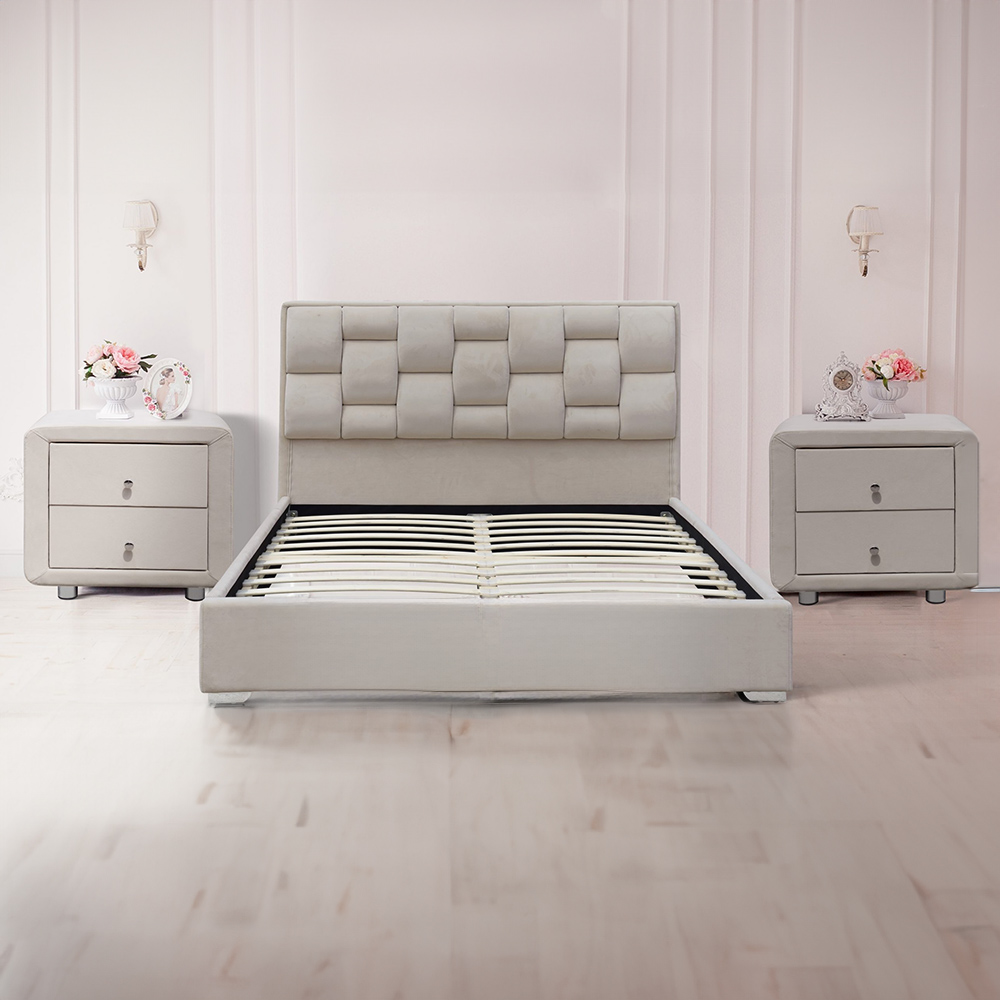 Uplift the look in your bedroom with the stylish Brooklyn king-size bed, beautifully upholstered in a cream plush velvet. It features a unique weaved effect padded headboard. It is made from a solid wooden frame and has a sprung slatted base to give support to the mattress and give you a fully supportive and comfortable night's sleep. This bed frame is accompanied by 2 stunning upholstered bedside tables