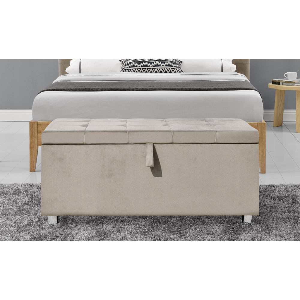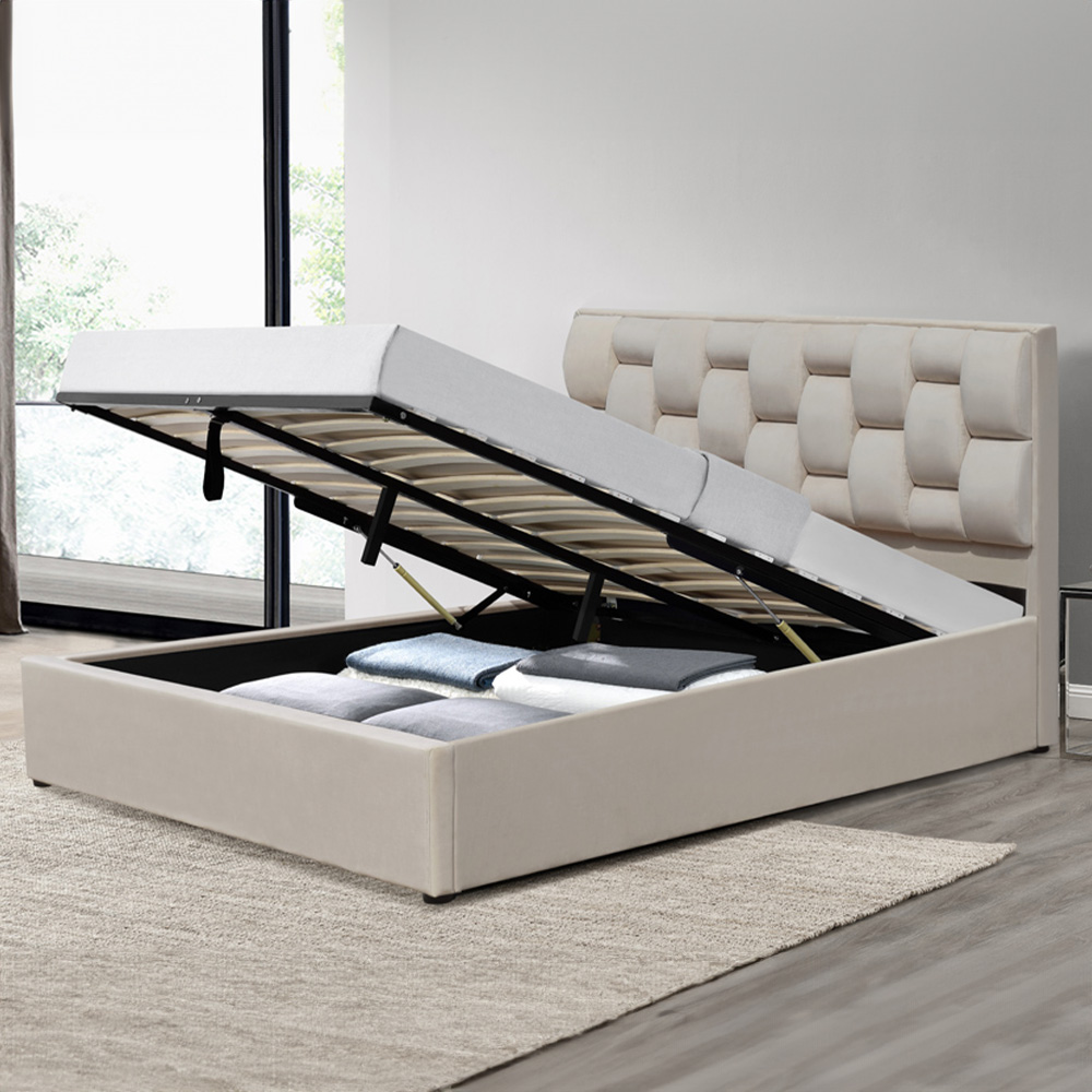 This stylish Brooklyn King Size Cream Plush Velvet Weaved Headboard Storage Ottoman Bed Frame With 2 Bedside Tables And Blanket Box is beautifully upholstered in a cream plush velvet. It features a unique weaved effect padded headboard. It is made from a solid wooden frame and has a sprung slatted base to give support to the mattress and give you a fully supportive and comfortable night's sleep. The ottoman aspect of this bed frame is operated using a gas lift mechanism that lifts up the mattress to reveal ample storage space. This bed frame is accompanied by 2 stunning upholstered bed side tables and a blanket box.