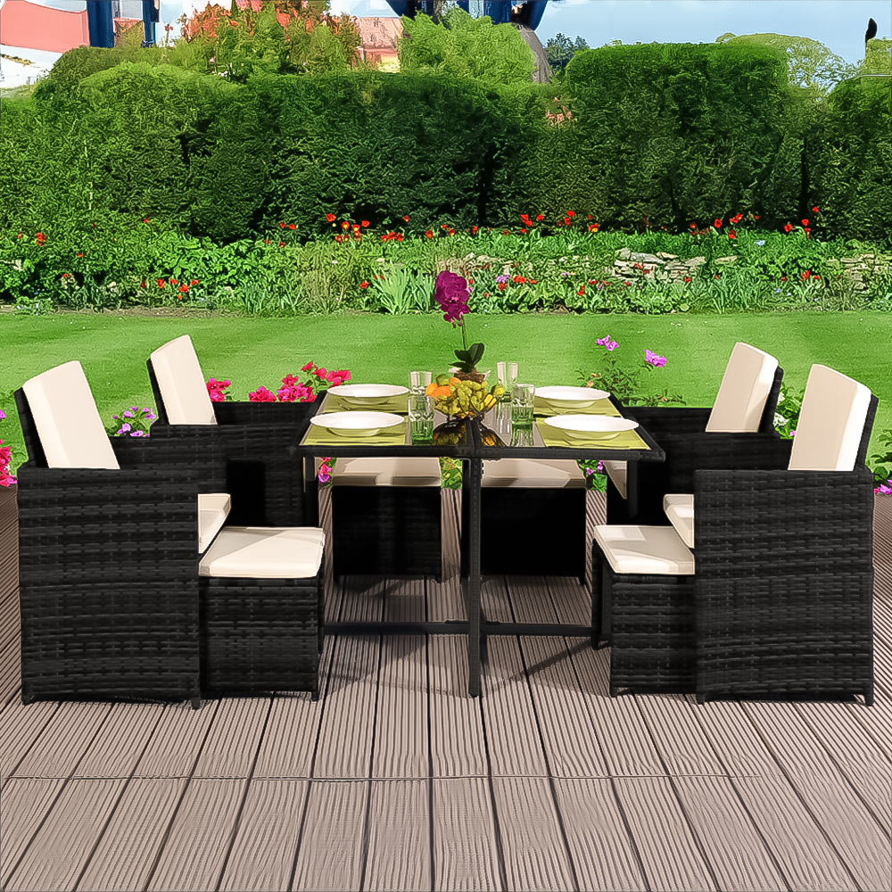 Comfortable and convenient, the Brooklyn Cube Black 4 Seater Garden Dining Set with Cover will make a great addition to your outdoor space. Designed for both relaxation and practicality, this set has super soft armchairs padded with cushioned seating and backrests, ensuring a luxurious lounging experience. Accompanied by 4 footstools and a dining table featuring a tempered glass top and interwoven frame finish, this set looks elegant and sophisticated. It has a unique space saving design that allows you to easily pack it away when not in use. The footstools can be stored under the chairs and the backrests can be tucked under the table, forming a cube for effortless storage. Plus, with seat cushions that are machine washable and weather-resistant, maintenance is easier than ever. Elevate your outdoor dining experience with this set. Protect your garden furniture with our durable and waterproof covers. Explore our wide range of heavy-duty Garden Furniture covers to find the perfect fit for your needs.