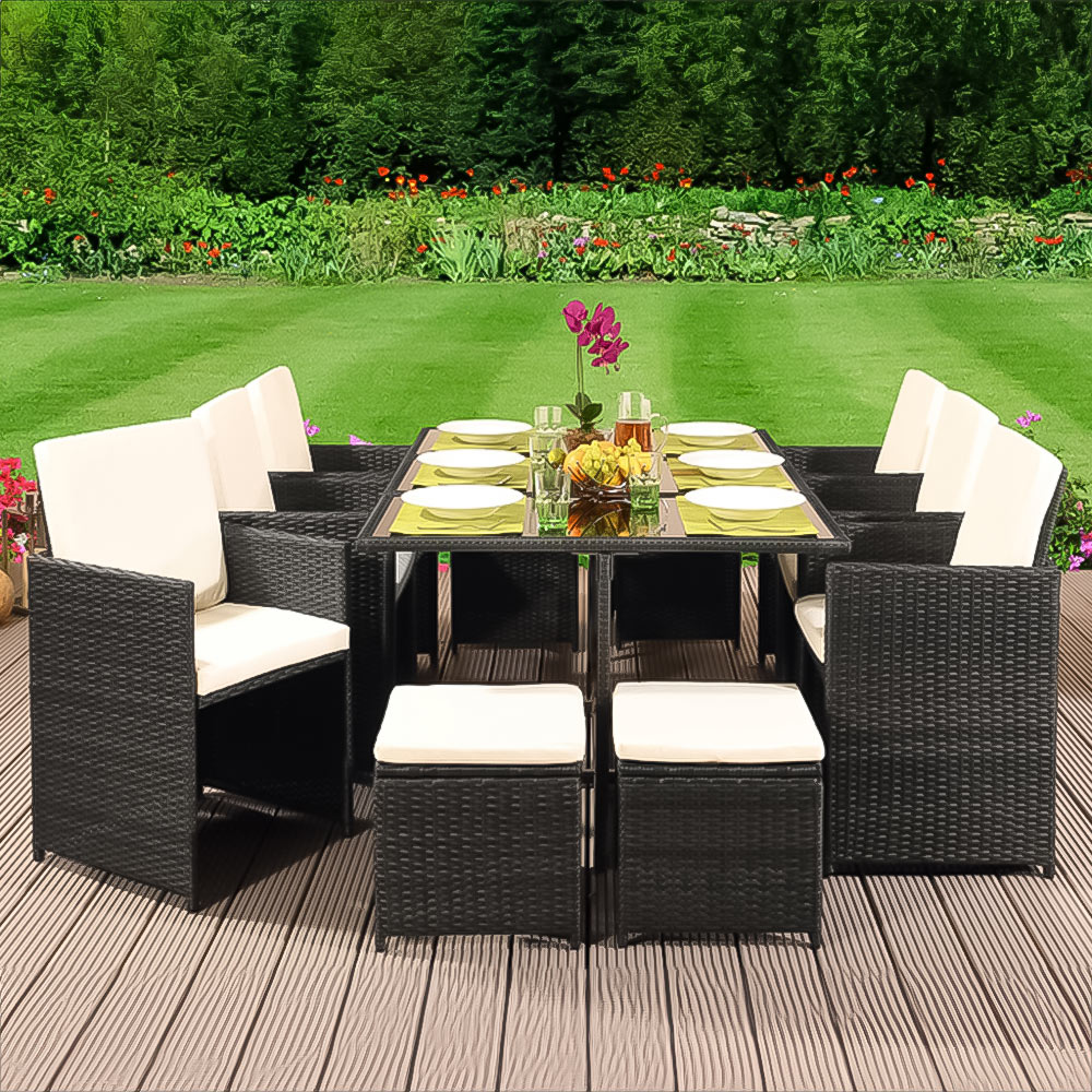 Comfortable and convenient, the Brooklyn Cube Dark Grey 6 Seater Garden Dining Set will make a great addition to your outdoor space. Designed for both relaxation and practicality, this set has super soft armchairs padded with cushioned seating and backrests, ensuring a luxurious lounging experience. Accompanied by 4 footstools and a dining table featuring a tempered glass top and interwoven frame finish, this set looks elegant and sophisticated. It has a unique space saving design that allows you to easily pack it away when not in use. The footstools can be stored under the chairs and the backrests can be tucked under the table, forming a cube for effortless storage. Plus, with seat cushions that are machine washable and weather-resistant, maintenance is easier than ever. Elevate your outdoor dining experience with this set. Protect your garden furniture with our durable and waterproof covers. Explore our wide range of heavy-duty Garden Furniture covers to find the perfect fit for your needs.