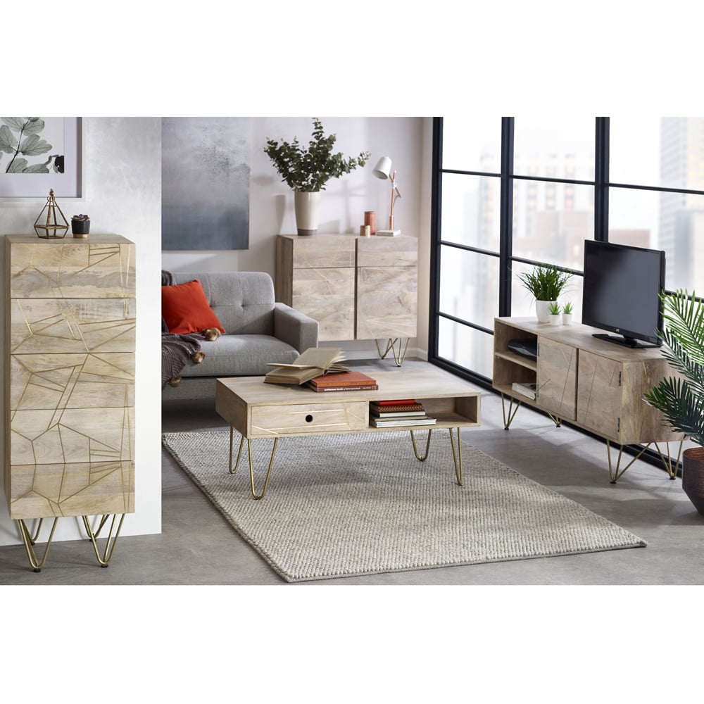 This modern contemporary furniture features metal inlays on solid wood, creating an abstract design that elevates furniture-making. The metal angled legs enhance its retro vintage appearance.
