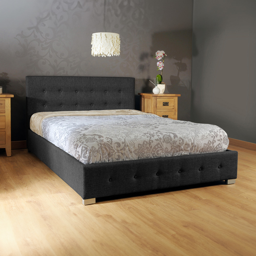 Upgrade your bedroom decor with the Brooklyn King Size Black Fabric Ottoman Storage Bed. This stylish and functional bed features a sleek square headboard with button details on the head and footboard. Finished with light wood feet, this bed exemplifies contemporary charm. The innovative gas lift mechanism effortlessly raises the mattress and base to reveal a large storage space, offering a seamless blend of convenience and comfort. Supported by a solid beech slat framework, this bed frame ensures both durability and comfort.