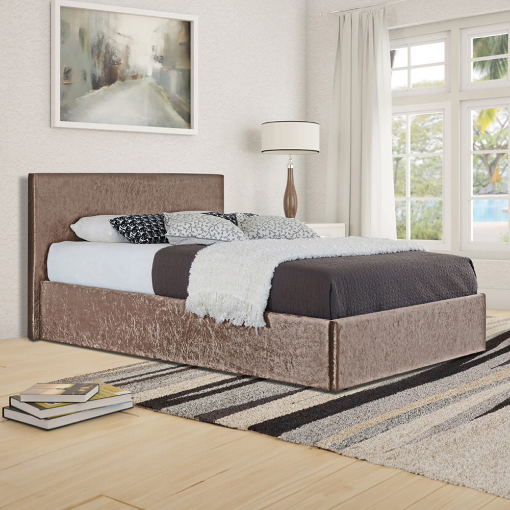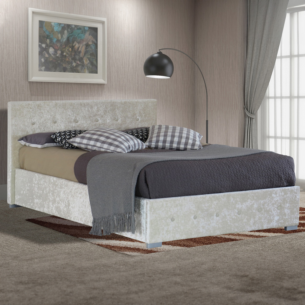Make a statement with your bedroom decor with the luxurious Brooklyn King Size Cream Crushed Velvet Ottoman Storage Bed. This sleek centrepiece is completely upholstered in a gorgeous crushed velvet fabric. With its elegant design, this bed frame is the perfect addition to any contemporary bedroom decor. The high padded panelled headboard with stitching detail gives it an opulent look, while the low footboard and sturdy metal frame with a sprung slatted base provide style and support. The innovative hydraulic gas lift system effortlessly raises the mattress and base to reveal a large storage space which extends to the floor, offering a seamless blend of convenience and comfort.