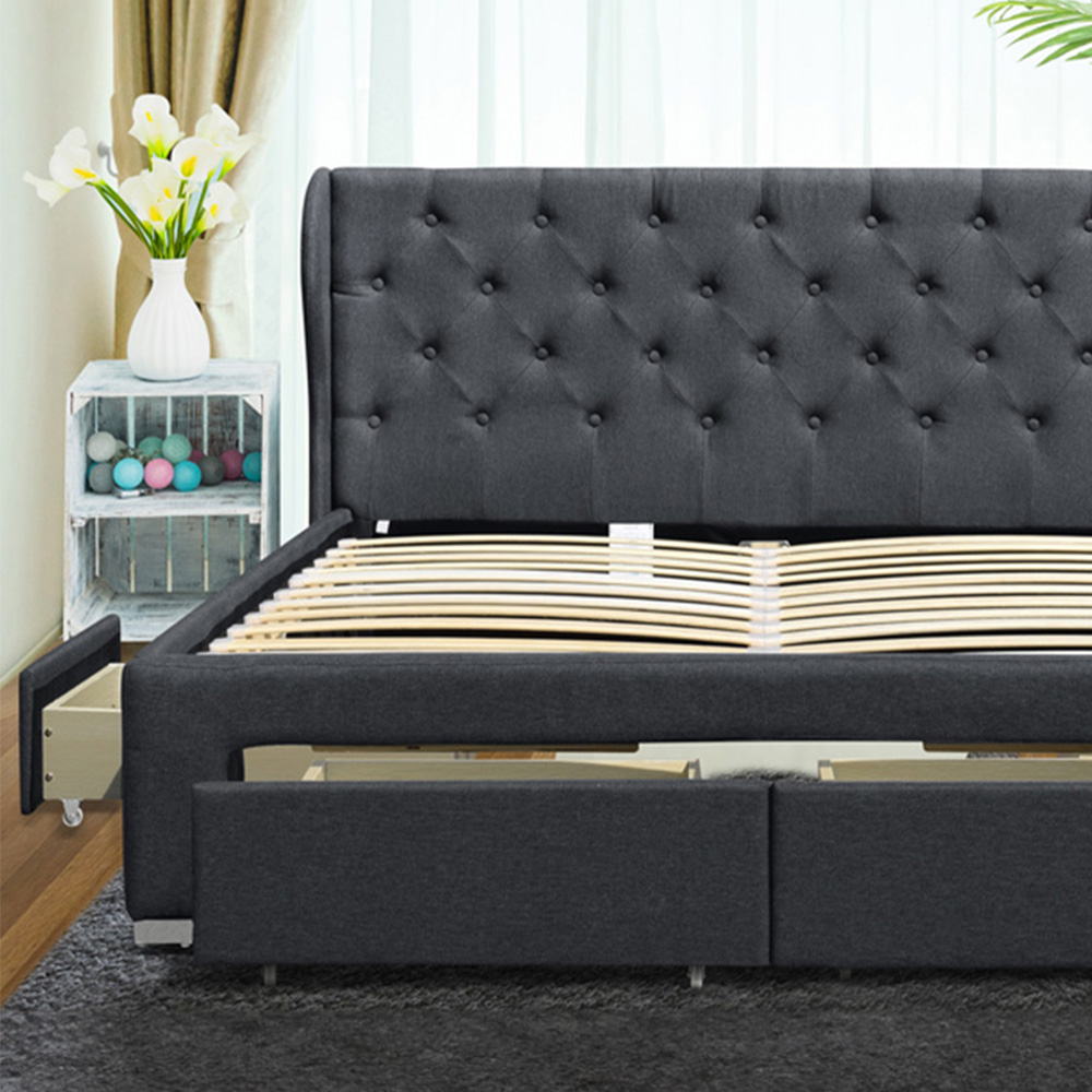 Bring a touch of elegance to your bedroom with this Brooklyn King Size Grey Linen Upholstered Bed Frame with Winged Headboard. The spacious bed comes in a gorgeous grey shade and features a stylish winged headboard. It also features four handy drawers for extra storage space. Crafted from solid wood, it comes with a sprung slatted base to help support the mattress so you can get a good night's sleep.