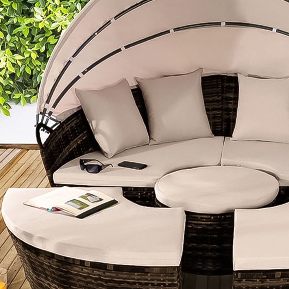 Redefine relaxation with the Brooklyn Luxury 8 Seater Brown Rattan Sun Lounger Sofa Set with Canopy and Cover 160cm. This versatile lounger seats up to eight people and effortlessly transforms from a lavish daybed to a chic seating area for entertaining guests. The centre piece doubles as a convenient coffee table without its cushion, adding functionality. With cushioned seating and scatter cushions that are removable and machine washable, durability meets elegance in this sun lounger. Elevate your outdoor gatherings with this stylish addition. Protect your garden furniture with our durable and waterproof covers. Explore our wide range of heavy-duty Garden Furniture covers to find the perfect fit for your needs.
