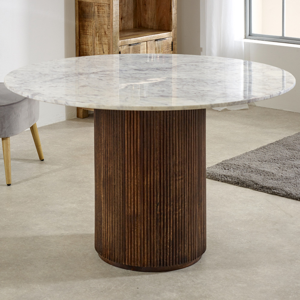 This round dining table would be perfect for a lounge/diner. The stunning simplicity of the natural marble with the fluted wooden pedestal is exquisite and will certainly be a statement piece in your home. Completely handmade by our skilled craftsmen in India using eco-friendly materials. Made from 100% mango wood and natural marble.