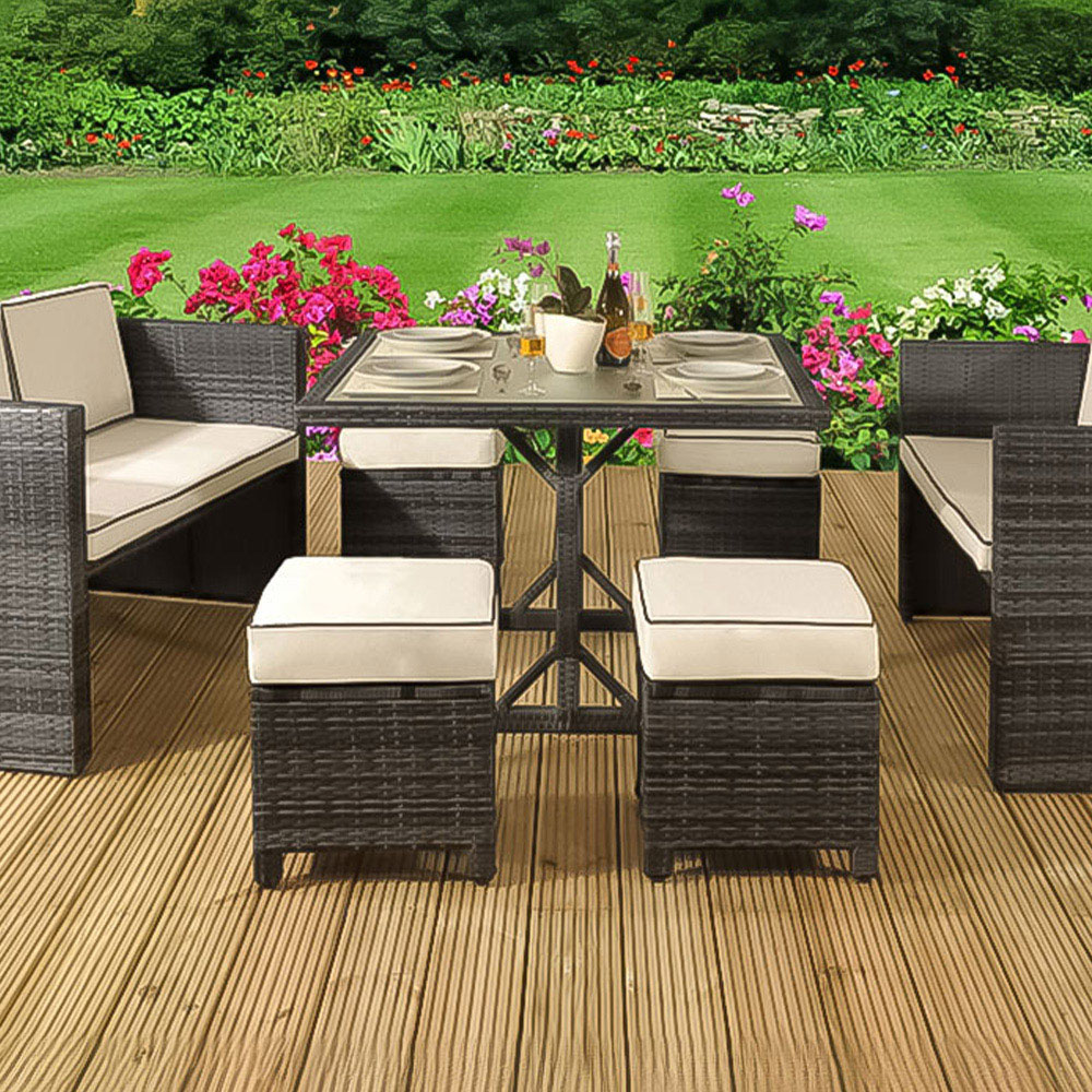 Bring the stylish and practical solution for your outdoor sitting area with the Brooklyn Eight Seater Grey Rattan Garden Sofa Set. This seven-piece cushioned rattan furniture set can seat eight people with its contemporary cube design. This set comes with two two-seater sofas, four ottoman footstools and a dining table with a tempered glass top and interwoven frame finish. The seat cushions are cream-coloured and designed to resist the elements with showerproof covers that are removable and machine washable. The ottoman footstools can be neatly stored away under the table for a practical, space-saving storage solution when not in use. Protect your garden furniture with our durable and waterproof covers. Explore our wide range of heavy-duty Garden Furniture covers to find the perfect fit for your needs.