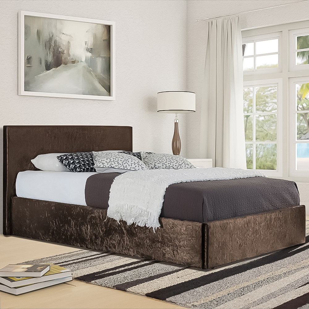 Make a comfortable addition to your bedroom with the Brooklyn Single Brown Crushed Velvet Ottoman Bed Frame. This modern bed frame is upholstered in a soft crushed velvet fabric and makes an elegant bedroom centrepiece with its stylish, minimalist design. It is further complemented by the high padded panelled headboard with stitching detail, low footboard with a sturdy metal frame, and posture-sprung slatted base. This bed incorporates a hydraulic gas lift system that raises the mattress and base to provide easy access to the storage space below. The storage area on this is straight to the floor and has no base.