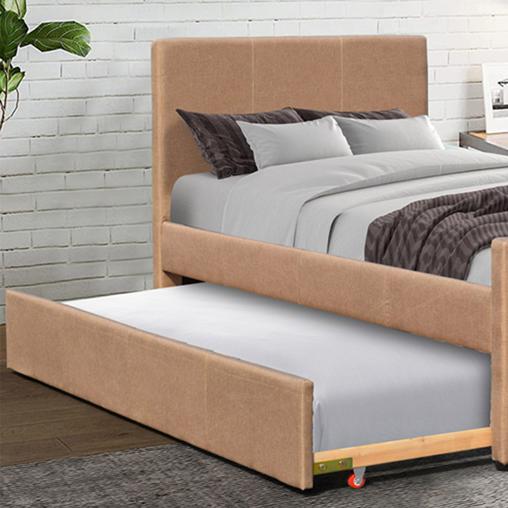 Upgrade your room with a Brooklyn Single Brown Fabric Bed Frame With Trundle. It features a padded headboard, base & sides for added comfort and back support, as well as sprung wooden slats for support and strength. Ideal for sleepovers, space space-saving pull-out trundle can be used for storage, if not being used with a second mattress.