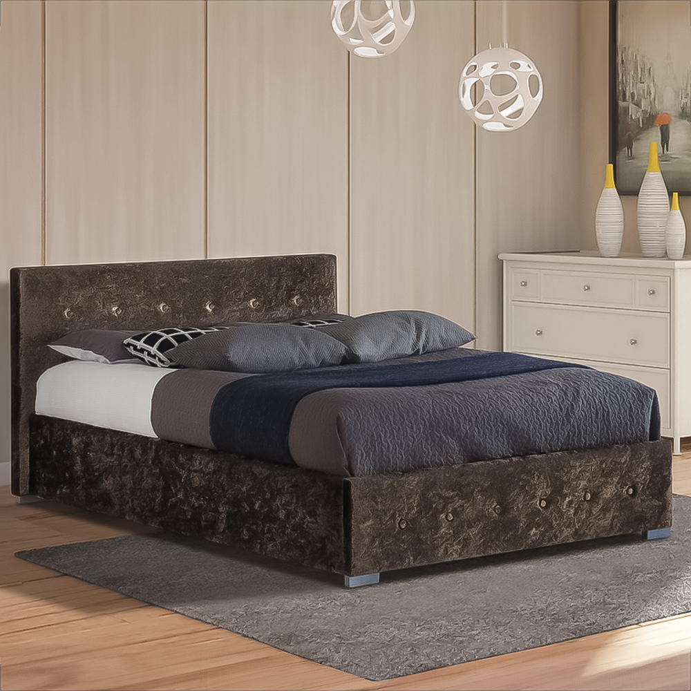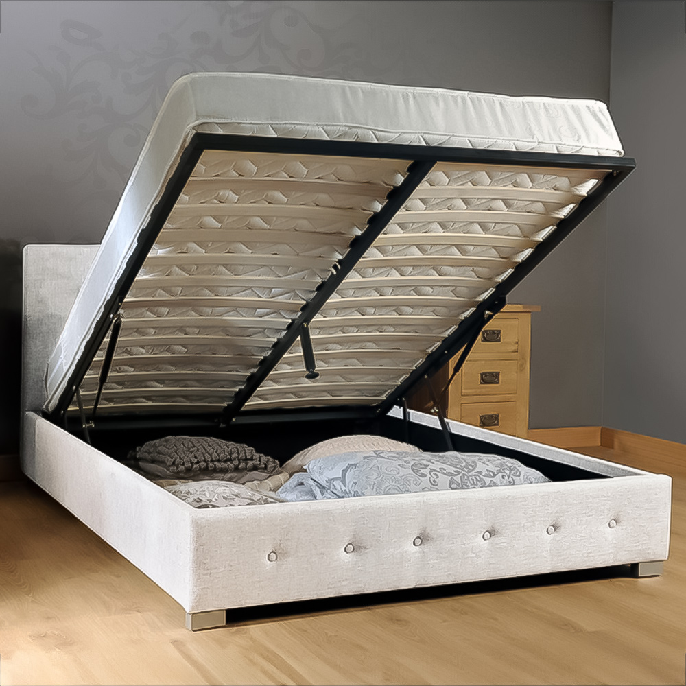Make a comfortable addition to your bedroom with the Brooklyn Single Cream Crushed Velvet Ottoman Storage Gaslift Bed Frame. This bed frame is finely upholstered in a crushed velvet fabric with a metallic shimmer. It features a padded headboard and footboard, classic button detailing, and padded side panels. The bed frame also comes with a metal gas lift mechanism, which allows the mattress to lift up, revealing a straight-to-floor storage space underneath to suit all your needs. The mattress is supported on solid beech slats and a metal framework.