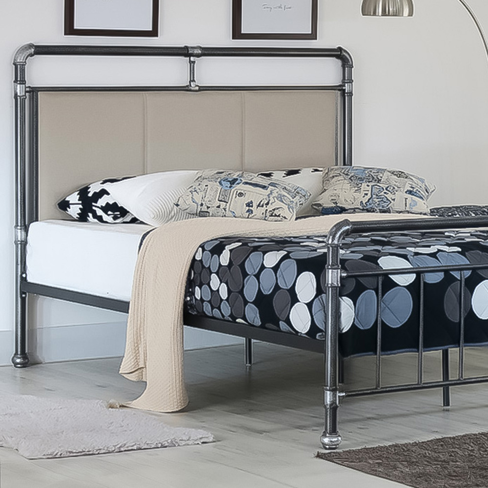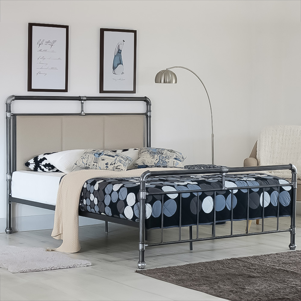 Make a comfortable addition to your bedroom with this Brooklyn Single Metal Industrial Scaffold Pipe Bed Frame. This industrial scaffold pipe style metal bed frame is made from solid metal tube-style framework and finished in an antique metallic finish. The bed features a grey padded luxury fabric headboard. It also has the addition of sprung wooden slats to give support to the mattress and give you a fully supportive and comfortable night's sleep.