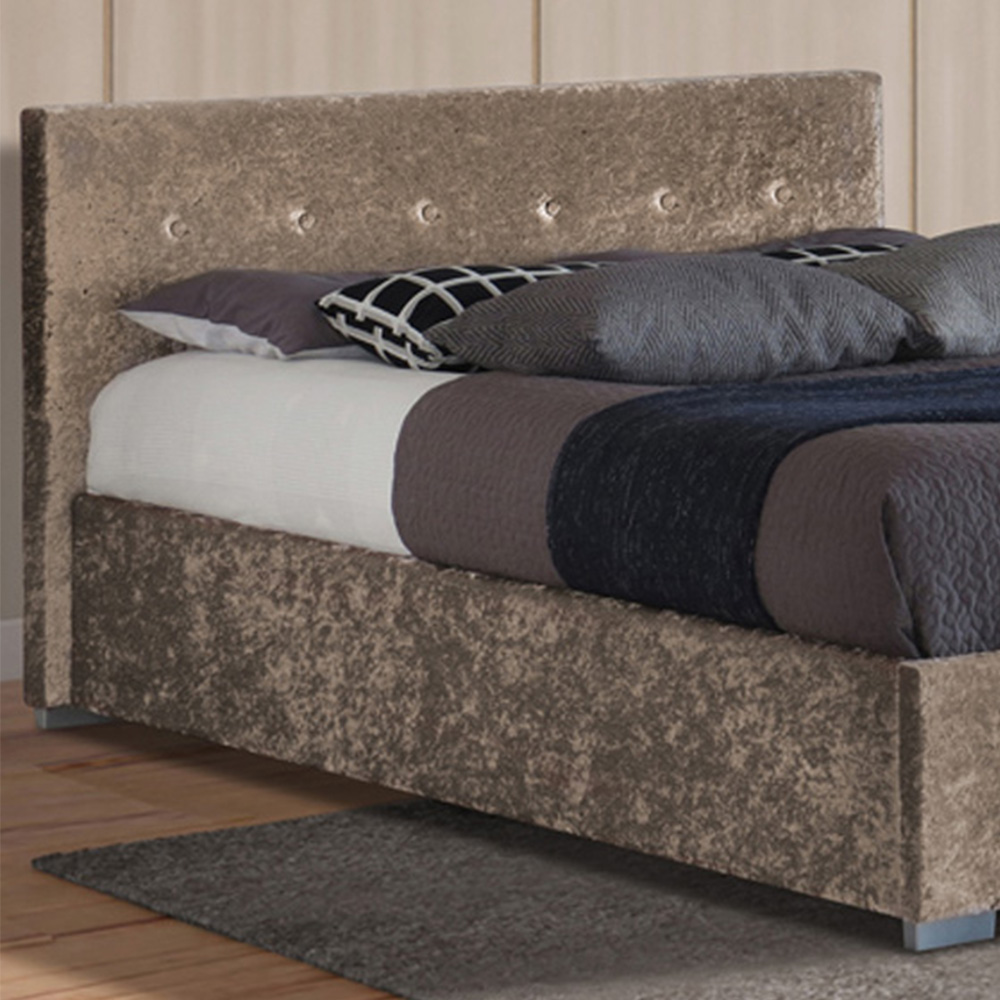 Make a comfortable addition to your bedroom with the Brooklyn Single Truffle Crushed Velvet Ottoman Storage Gaslift Bed Frame. This bed frame is finely upholstered in a crushed velvet fabric with a metallic shimmer. It features a padded headboard and footboard, classic button detailing, and padded side panels. The bed frame also comes with a metal gas lift mechanism, which allows the mattress to lift up, revealing a straight-to-floor storage space underneath to suit all your needs. The mattress is supported on solid beech slats and a metal framework.
