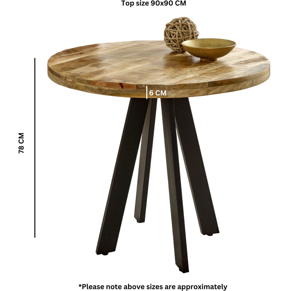 The 4 seater round dining table in this Range is perfect for both entertaining dinner guests and family meals. The rough sawn laquered finish top and the spider metal legs are both rustic and modern, highlighting the natural beauty of the wood with a handmade unique look and feel. Made entirely using 100% Eco sourced solid natural wood by skilled craftsmen in India.