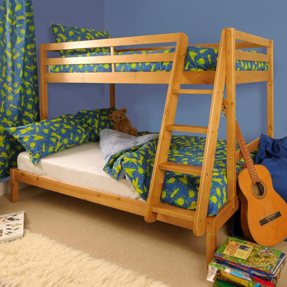 Transform your child's room with this space-saving Brooklyn Triple Sleeper Caramel Wooden Bunk Bed. This bunk bed is made using solid pine and slatted bases for support and stability. The top bunk features safety rails all around the bed to ensure that your little one sleeps safely. Also, it comes with a single bed on the top and a small double bed on the bottom to comfortably accommodate three children.