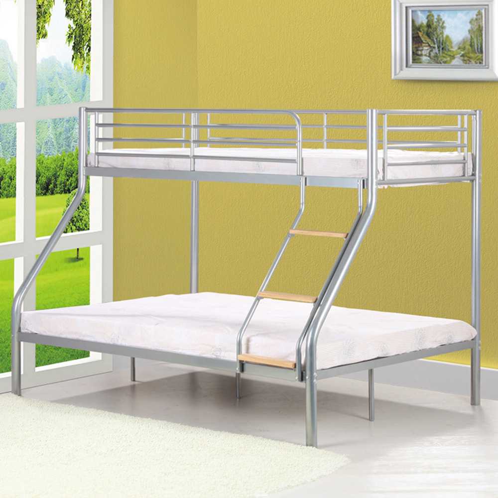 Add this fun and interesting Brooklyn Triple Metal Bunk Bed. This metal triple sleeper is the perfect addition to a child's bedroom. It is Perfect if you need to save space. The top bunk is a standard Single bed, the bottom bunk is a full-size double bed. The bottom bunk comfortably accommodates 2 adults. The metal tubular rails give this bunk a contemporary, modern look. The top bunk has the all-important safety rails, to put your mind at rest, with the same tubular design. The ladder has beech-effect rungs, for added comfort when climbing up to the top bunk. The ladder is fixed to the right-hand side.
