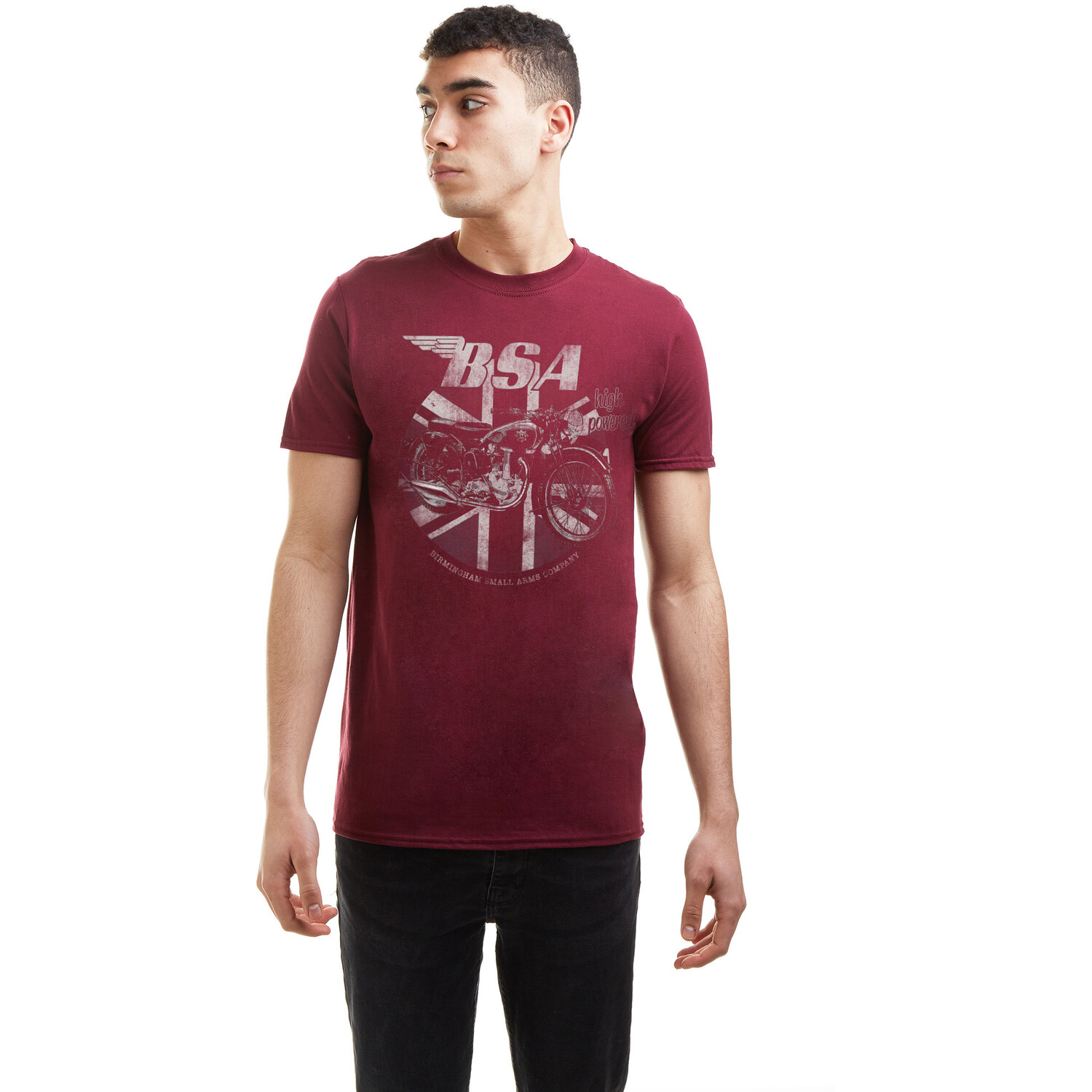 Fun and stylish, this BSA T-Shirt Maroon is a must-have for motorcycle enthusiasts. With a trendy distressed design featuring a motorbike on a faded union jack print, this t-shirt is excellent for everyday casual wear.