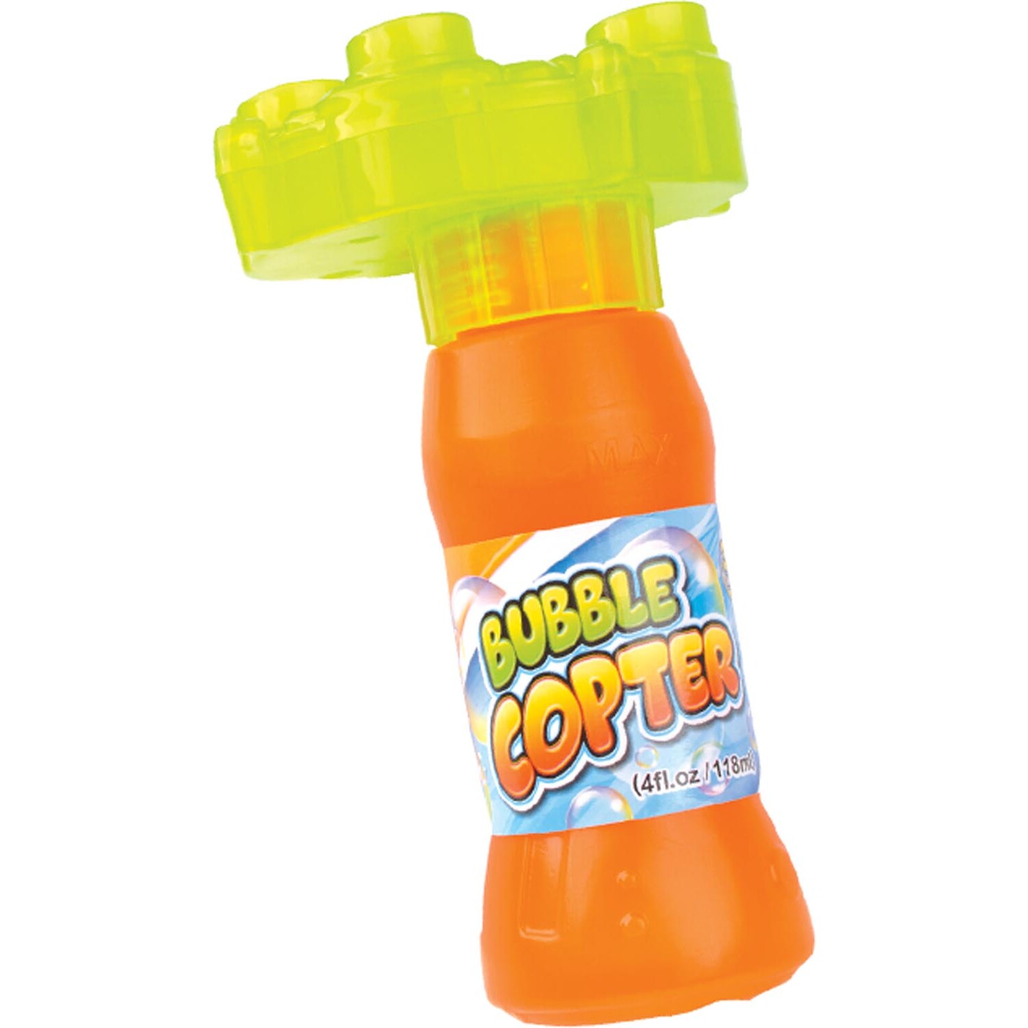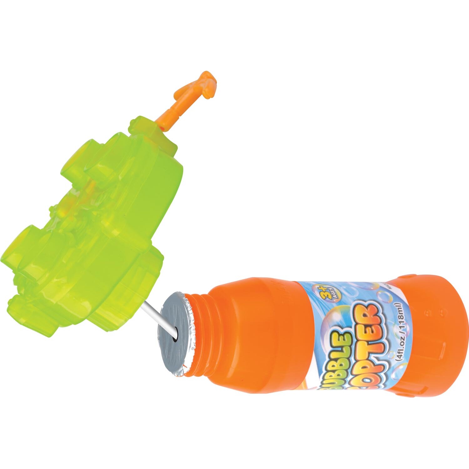 The Bubble Copter with Bubble Solution is a unique and entertaining way to blow and chase bubbles. Attach the straw to the base of the launch pad, screw the launch pad back onto the bubble solution bottle, place the helicopter's feet into the wells on the launch pad, squeeze the bottle until the solution half fills the launch pad, pull the cord and watch the bubble helicopter fly, releasing bubbles as it goes!