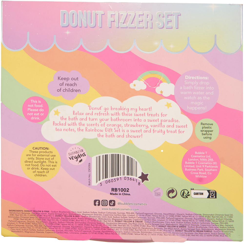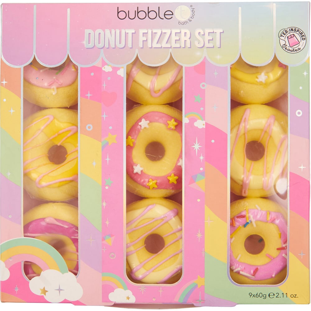 This Pack of 9 Rainbow Donut Bath Fizzers makes the perfect gift for a loved one. Inspired by sweet, delicious doughnuts, these bath fizzers even look like their delicious namesakes! Drop one of these delightful fizzers into your bath and sink in for a relaxing soak with notes of orange, strawberry, vanilla, and sweet tea.