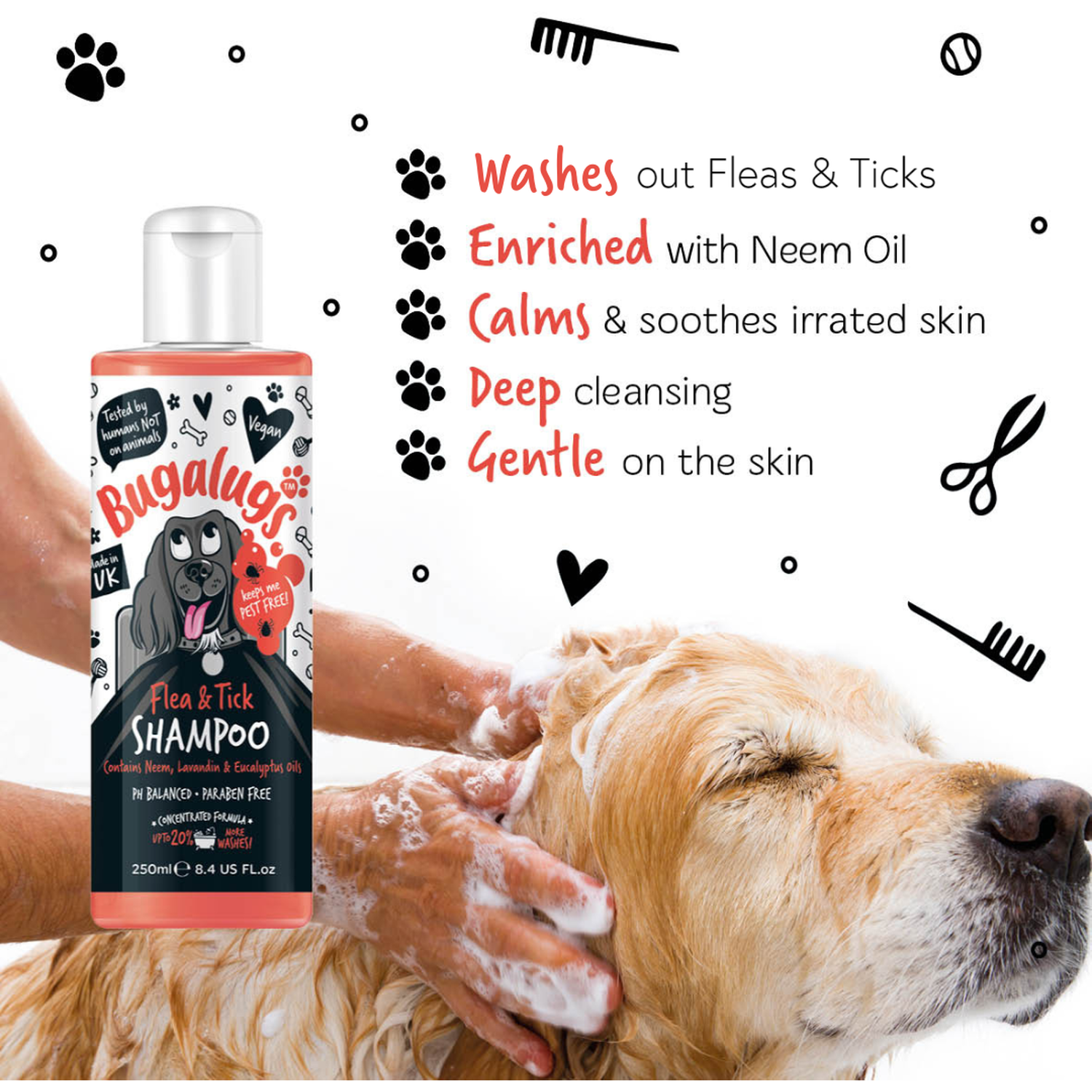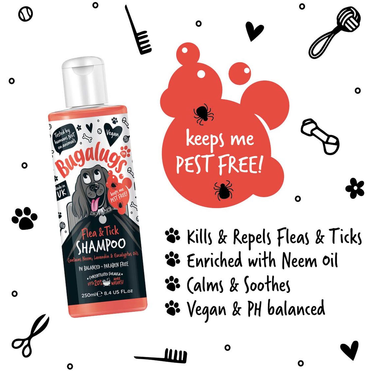 Ensure your dog's coat stays clean and healthy with the Bugalugs Flea and Tick Dog Shampoo 250ml. This vegan shampoo, enriched with neem oil, effectively targets fleas and ticks while soothing your pet's skin. Ideal for regular use, it provides, a gentle cleanse, helping your dog stay tick-free. Use it as part of your pet's grooming routine to maintain a clean, healthy coat and keep pesky friends away.
