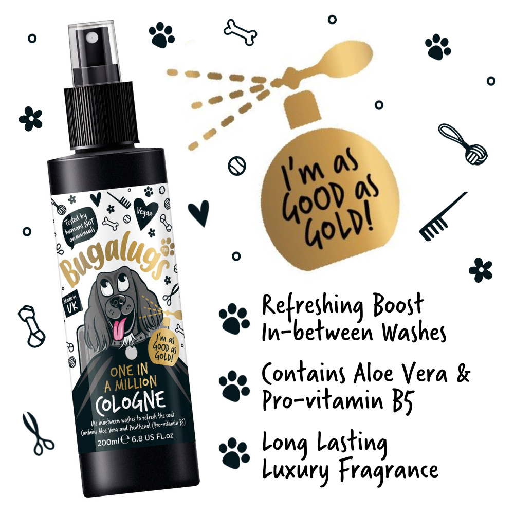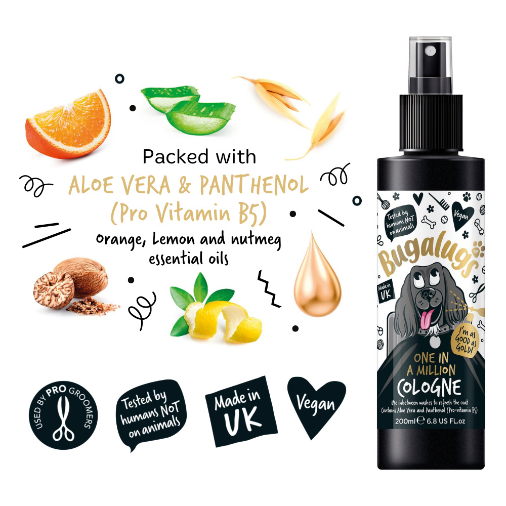 Keep your pets fresh and great smelling with this Bugalugs One Million Cologne Dog Spray. With a luxurious, one-in-a-million fragrance, it delivers long-lasting freshness. Also, it is packed with aloe vera and panthenol (pro-vitamin B5) and contains orange, lemon and nutmeg essential oils. Easy to use, spray onto a dry coat after grooming or use it in between washes to keep your dog's coat smelling great. This product is tested by humans and not on animals. Vegan. Size: 200ml.