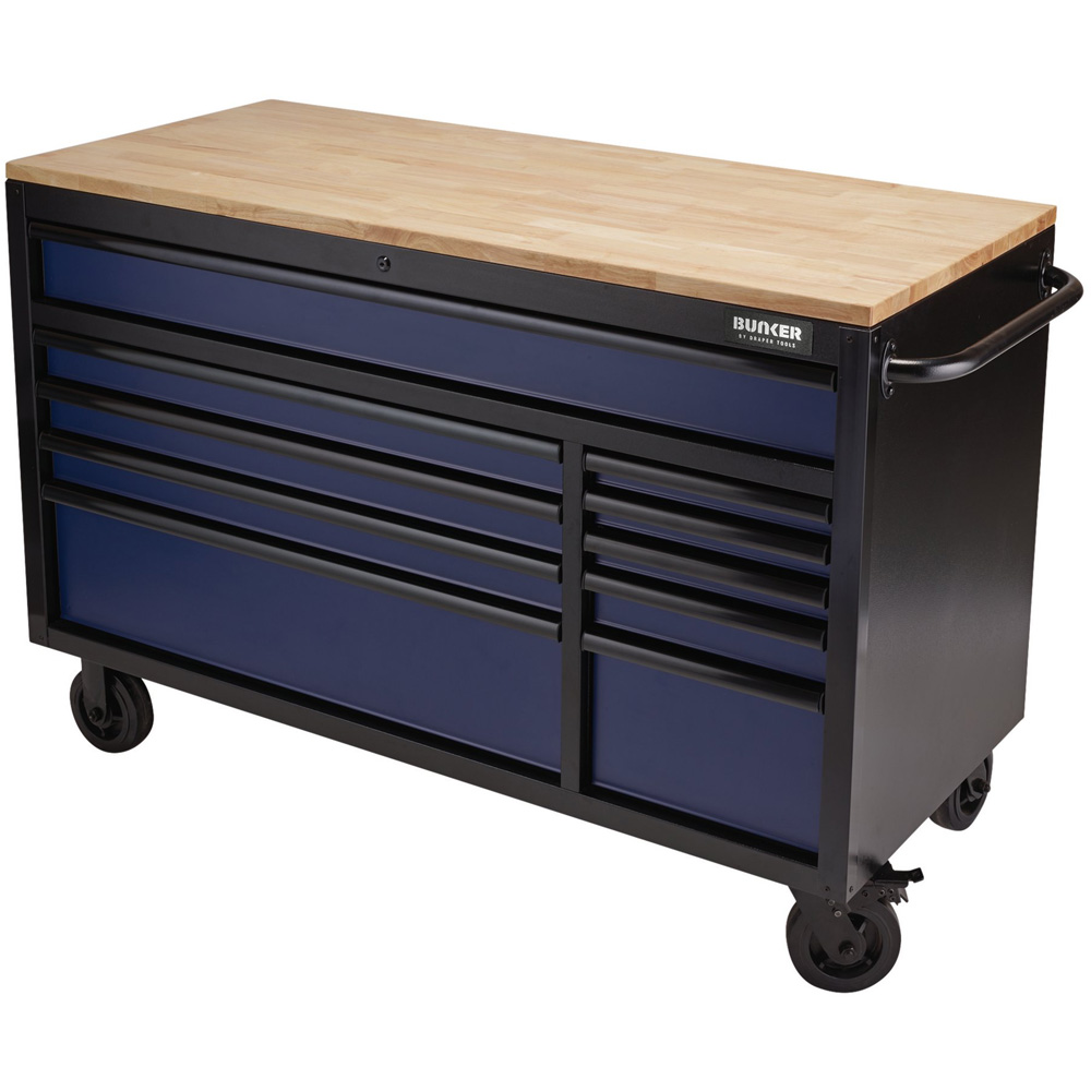Make a useful addition to your workspace with the Bunker Blue 10-Drawer Roller Cabinet. Part of the Bunker storage range, this stunningly designed 56-inch premium-quality steel unit has 10 drawers embellished with a stylish black anodised aluminium trim. Easy to use, each drawer has a smooth soft-close operation and is lined with lush foam to protect your tools. Also, the cabinet’s matt blue textured finish is highly durable, thanks to the industrial powder coating that protects against scratches, wear and corrosion. Versatile and simple to manoeuvre, this is a mobile cabinet, allowing you to keep essential items to hand wherever you need them in your garage and features a 25mm-thick hardwood worktop that spans the whole surface of the unit for a handy workspace. For added convenience, there is a steel handle and four durable castor wheels to move the cabinet effortlessly. Additionally, two of the wheels are also fitted with brakes to keep the tool cabinet still. Ensuring maximum safety, the cabinet has an integral lock for security and is supplied with two keys. The unit requires partial assembly and measures H973 x W1502 x D622mm. For your quality assurance, all Bunker units include a 10-year warranty. Static weight capacity single runner drawer: 50kg. Static weight capacity single runner drawer: 100kg. Assembled weight: 149.7kg. Size: 56 inches. Contents: 1 x Bunker workbench roller tool cabinet with 10 drawers.