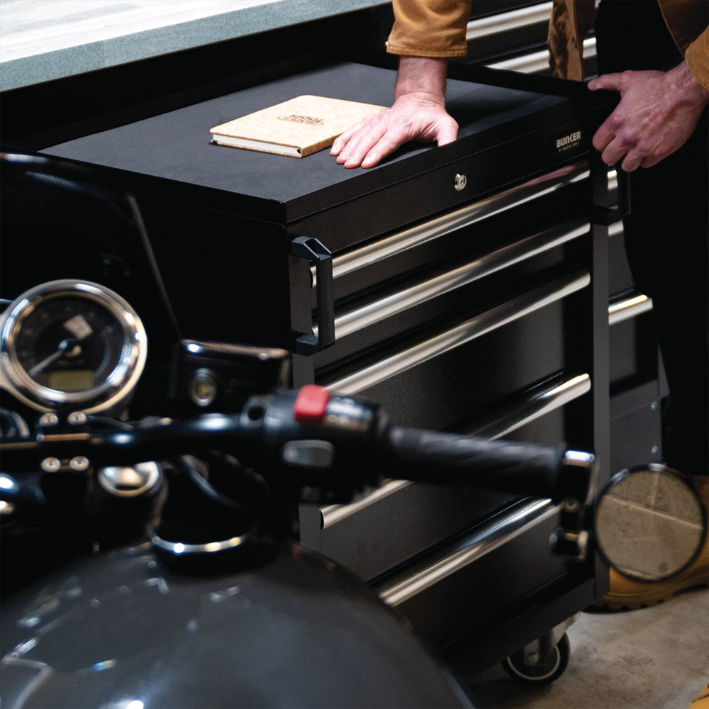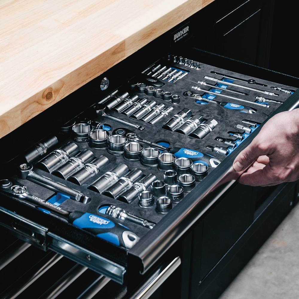 Add practicality to your workspace with this Bunker 11-Piece Modular Storage with Hardwood Worktop. Part of the Bunker modular storage system, this stunningly designed combo is easily installed inside a garage or workshop to create your ideal space. Stylish and durable, all units are made from premium-quality steel and have a durable matt black textured industrial powder-coated finish. Also, the floor cabinets are covered by a stylish hardwood worktop and provide incredibly versatile storage, featuring large cupboards with fully adjustable shelves and smooth soft-close drawers lined with lush foam to protect your tools. Easy to use, the fixed base cabinets have adjustable feet for optimal positioning on an uneven floor and all wall cabinets have lift-up doors for convenient access, operated by whisper-quiet gas struts. For added storage, the back panels act as pegboards, and each includes one pre-cut hole for access to a power supply. Ensuring maximum safety, each unit has an integral lock for security and is supplied with two keys. Ensuring hassle-free usage, the combo comes with all the required fittings for simple installation and a 10-year warranty for quality assurance. Lastly, the combo includes a free magnet with a distinctive logo. Size: H2000 x W1960 x D463mm. Please note: There is no next-day or weekend delivery service on the Bunker combo range as the products are carefully packed before being dispatched. You will be contacted to arrange a suitable date for delivery. Their high-quality construction means that some products are heavy and will require two people to lift them. Contents: 1 x Modular two-door floor cabinet, 680mm 1 x Modular five-drawer floor cabinet, 680mm 2 x Modular wall cabinets, 680mm 1 x Modular one-door tall floor cabinet, 600mm 1 x Modular hardwood worktop, 1360mm 2 x Modular back panels, 602mm 2 x Modular side wall single brackets and 1 x Modular side wall double bracket.