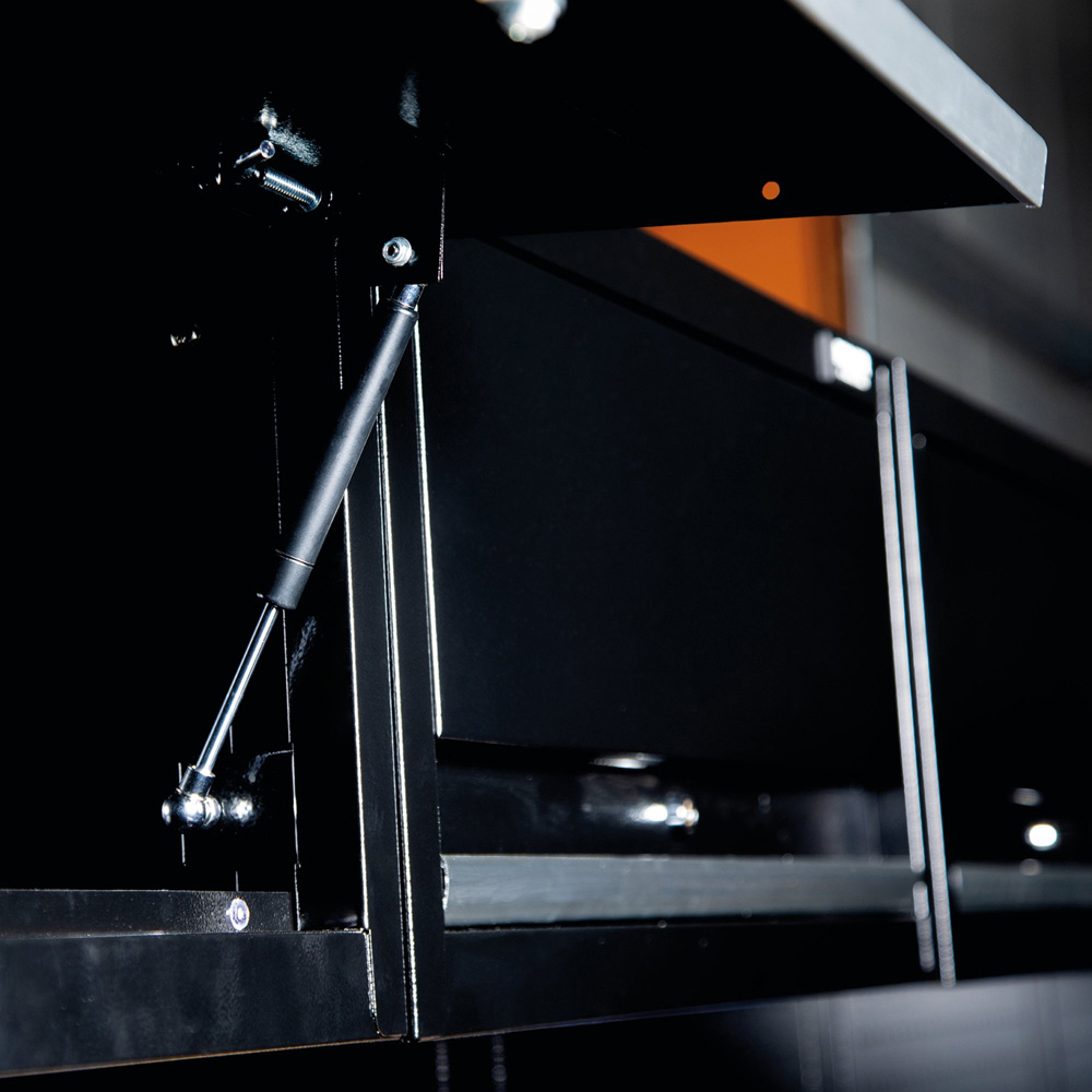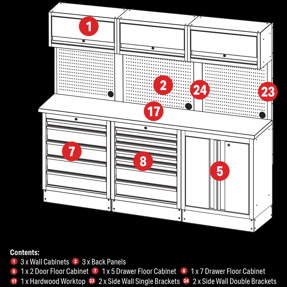 Make a practical and durable addition to your workspace with this Bunker 14-Piece Modular Storage with Hardwood Worktop. Part of the Bunker modular storage system, this stunningly designed combo is easily installed inside a garage or workshop to create your ideal storage system. Stylish and durable, all units are made from premium-quality steel and have a durable matt black textured industrial powder-coated finish. Also, the floor cabinets are covered by a stylish hardwood worktop and provide incredibly versatile storage, featuring large cupboards with fully adjustable shelves and smooth soft-close drawers lined with lush foam to protect your tools. Easy to use, the fixed base cabinets have adjustable feet for optimal positioning on an uneven floor and all wall cabinets have lift-up doors for convenient access, operated by whisper-quiet gas struts. For added storage, the back panels act as pegboards, and each includes one pre-cut hole for access to a power supply. Ensuring maximum safety, each unit has an integral lock for security and is supplied with two keys. Ensuring hassle-free usage, the combo comes with all the required fittings for simple installation and a 10-year warranty for quality assurance. Lastly, the combo includes a free magnet with a distinctive logo. Size: H2000 x W2040 x D463mm. Please note: There is no next-day or weekend delivery service on the Bunker combo range as the products are carefully packed before being dispatched. You will be contacted to arrange a suitable date for delivery. Their high-quality construction means that some products are heavy and will require two people to lift them. Contents: 1 x Modular two-door floor cabinet, 680mm 1 x Modular five-drawer floor cabinet, 680mm 1 x Modular seven-drawer floor cabinet, 680mm 3 x Modular wall cabinets, 680mm 1 x Modular hardwood worktop, 2040mm 3 x Modular back panels, 602mm 2 x Modular side wall single brackets and 2 x Modular side wall double brackets.