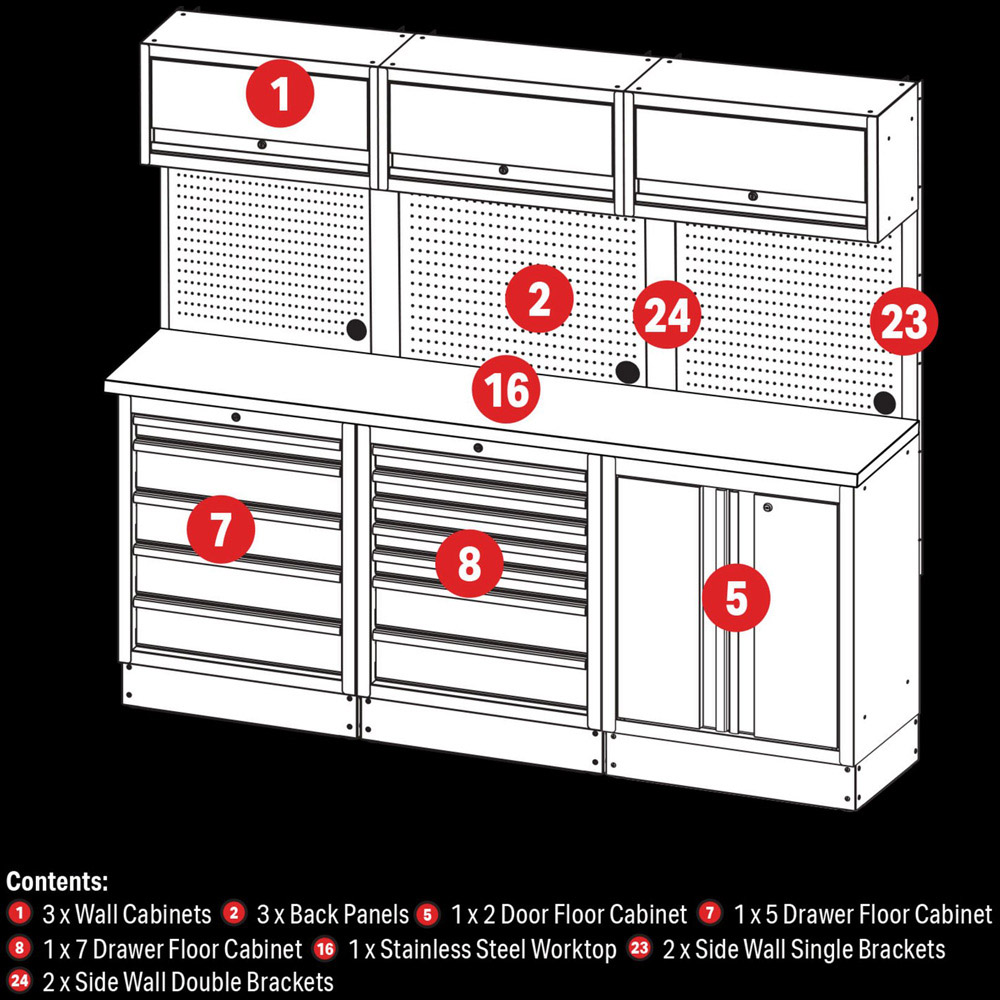 Make a practical and durable addition to your workspace with this Bunker 14-Piece Modular Storage with Stainless Steel Worktop. Part of the Bunker modular storage system, this stunningly designed combo is easily installed inside a garage or workshop to create your ideal storage system. Stylish and durable, all units are made from premium-quality steel and have a durable matt black textured industrial powder-coated finish. Also, the floor cabinets are covered by a stylish stainless steel worktop and provide incredibly versatile storage, featuring large cupboards with fully adjustable shelves and smooth soft-close drawers lined with lush foam to protect your tools. Easy to use, the fixed base cabinets have adjustable feet for optimal positioning on an uneven floor and all wall cabinets have lift-up doors for convenient access, operated by whisper-quiet gas struts. For added storage, the back panels act as pegboards, and each includes one pre-cut hole for access to a power supply. Ensuring maximum safety, each unit has an integral lock for security and is supplied with two keys. Ensuring hassle-free usage, the combo comes with all the required fittings for simple installation and a 10-year warranty for quality assurance. Lastly, the combo includes a free magnet with a distinctive logo. Size: H2000 x W2040 x D463mm. Please note: There is no next-day or weekend delivery service on the Bunker combo range as the products are carefully packed before being dispatched. You will be contacted to arrange a suitable date for delivery. Their high-quality construction means that some products are heavy and will require two people to lift them. Contents: 1 x Modular two-door floor cabinet, 680mm 1 x Modular five-drawer floor cabinet, 680mm 1 x Modular seven-drawer floor cabinet, 680mm 3 x Modular wall cabinets, 680mm 1 x Modular stainless steel worktop, 2040mm 3 x Modular back panels, 602mm 2 x Modular side wall single brackets and 2 x Modular side wall double brackets.