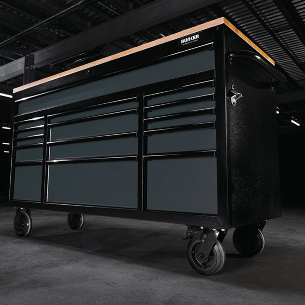 Make working easy with this Bunker Grey 15-Drawer Roller Cabinet. Part of the Bunker storage range, this stunningly designed 61-inch premium-quality steel unit has 15 drawers embellished with a stylish black anodised aluminium trim. Easy to use, each drawer has a smooth soft-close operation and is lined with lush foam to protect your tools. Also, the cabinet’s matt grey textured finish is highly durable, thanks to the industrial powder coating that protects against scratches, wear and corrosion. Versatile and simple to manoeuvre, this is a mobile cabinet, allowing you to keep essential items to hand wherever you need them in your garage and features a 25mm-thick hardwood worktop that spans the whole surface of the unit for a handy workspace. For added convenience, there is a steel handle and four durable castor wheels to move the cabinet effortlessly. Additionally, two of the wheels are also fitted with brakes to keep the tool cabinet still. Ensuring maximum safety, the cabinet has an integral lock for security and is supplied with two keys. The unit requires partial assembly and measures H974 x W1631 x D584mm. For your quality assurance, all Bunker units include a 10-year warranty. Static weight capacity single runner drawer: 50kg. Static weight capacity single runner drawer: 100kg. Assembled weight: 182.5kg. Size: 61 inches. Contents: 1 x Bunker workbench roller tool cabinet with 15 drawers.