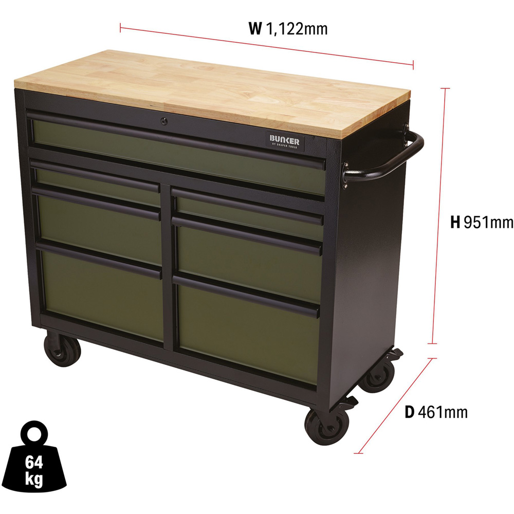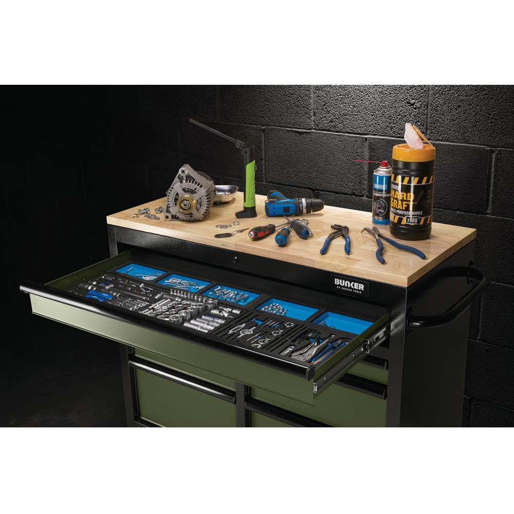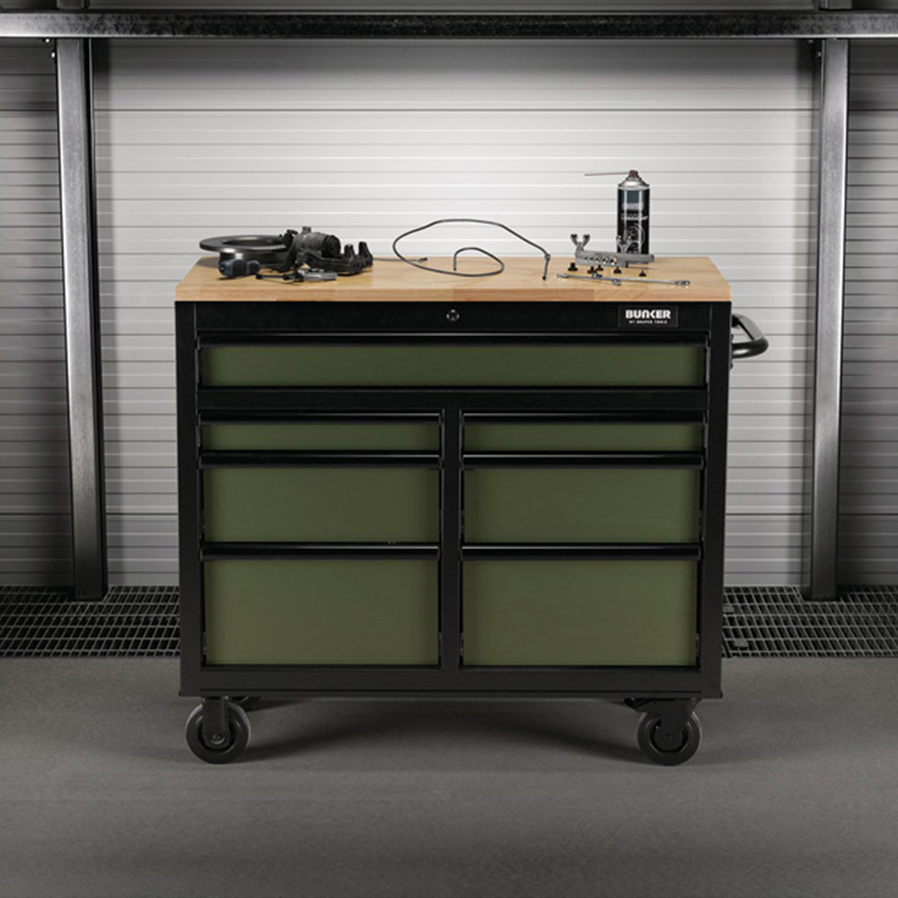 Make working easy with this Bunker Green 7-Drawer Roller Cabinet. Part of the Bunker storage range, this stunningly designed 41-inch premium-quality steel unit has seven drawers embellished with a stylish black anodised aluminium trim. Easy to use, each drawer has a smooth soft-close operation and is lined with lush foam to protect your tools. Also, the cabinet’s matt green textured finish is highly durable, thanks to the industrial powder coating that protects against scratches, wear and corrosion. Versatile and simple to manoeuvre, this is a mobile cabinet, allowing you to keep essential items to hand wherever you need them in your garage and features a 25mm-thick hardwood worktop that spans the whole surface of the unit for a handy workspace. For added convenience, there is a steel handle and four durable castor wheels to move the cabinet effortlessly. Additionally, two of the wheels are also fitted with brakes to keep the tool cabinet still. Ensuring maximum safety, the cabinet has an integral lock for security and is supplied with two keys. The unit requires partial assembly and measures H951 x W1122 x D461mm. For your quality assurance, all Bunker units include a 10-year warranty. Static weight capacity per drawer: 50kg. Assembled weight: 64kg. Size: 41 inches. Contents: 1 x Bunker workbench roller tool cabinet with seven drawers.