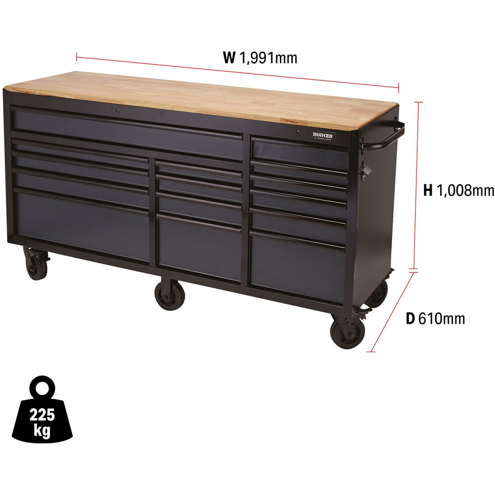 Make working easy with this Bunker Grey 15-Drawer Roller Cabinet. Part of the Bunker storage range, this stunningly designed 72-inch premium-quality steel unit has 15 drawers embellished with a stylish black anodised aluminium trim. Easy to use, each drawer has a smooth soft-close operation and is lined with lush foam to protect your tools. Also, the cabinet’s matt grey textured finish is highly durable, thanks to the industrial powder coating that protects against scratches, wear and corrosion. Versatile and simple to manoeuvre, this is a mobile cabinet, allowing you to keep essential items to hand wherever you need them in your garage and features a 25mm-thick hardwood worktop that spans the whole surface of the unit for a handy workspace. For added convenience, there is a steel handle and four durable castor wheels to move the cabinet effortlessly. Additionally, two of the wheels are also fitted with brakes to keep the tool cabinet still. Ensuring maximum safety, the cabinet has an integral lock for security and is supplied with two keys. The unit requires partial assembly and measures H1008 x W1991 x D610mm. For your quality assurance, all Bunker units include a 10-year warranty. Static weight capacity single runner drawer: 50kg. Static weight capacity single runner drawer: 100kg. Assembled weight: 225kg. Size: 72 inches. Contents: 1 x Bunker workbench roller tool cabinet with 15 drawers.