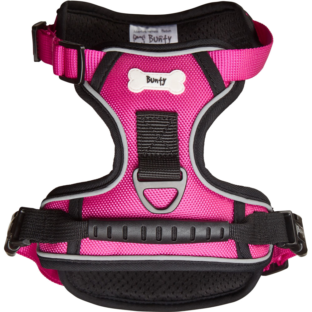 Does your dog have a taste for exploration? This water-resistant polyester Adventure Harness from Bunty comes with two separate attachment points. The first A-loop on the back gives your furry friend a greater degree of freedom, while the chest-mounted ring grants the owner a greater sense of control. The built-in reinforced rubber handle on the back allows you to pick up your pup quickly. It's designed with a large chest plate that provides an even spread of weight to prevent injury.