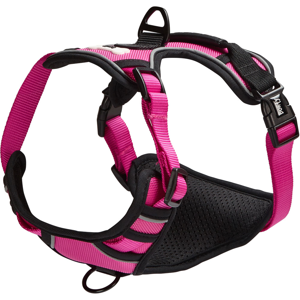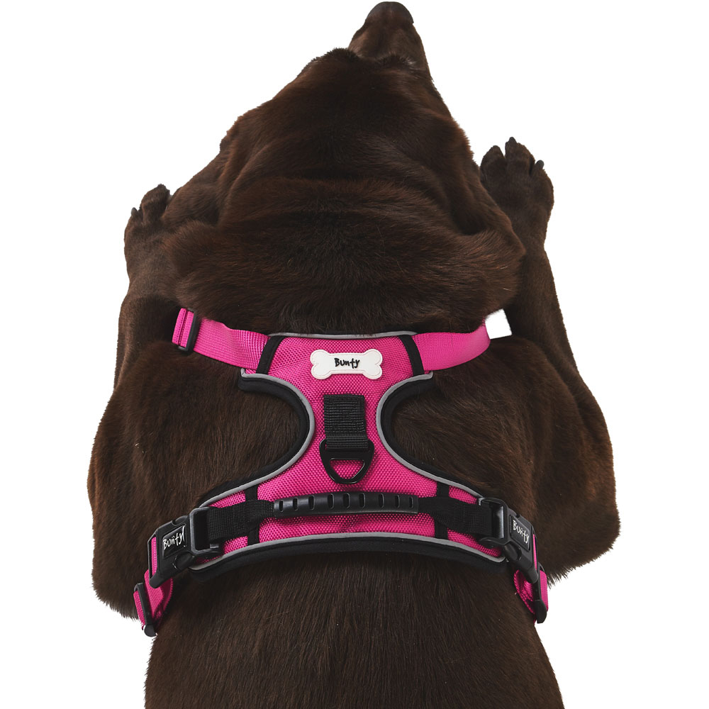 Does your dog have a taste for exploration? This water-resistant polyester Adventure Harness from Bunty comes with two separate attachment points. The first A-loop on the back gives your furry friend a greater degree of freedom, while the chest-mounted ring grants the owner a greater sense of control. The built-in reinforced rubber handle on the back allows you to pick up your pup quickly. It's designed with a large chest plate that provides an even spread of weight to prevent injury.