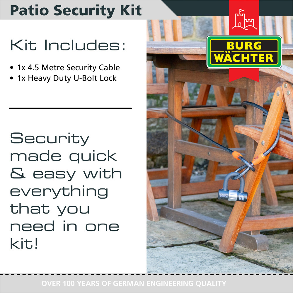 Secure your patio furniture with this Burg-Wachter Alternative Patio Security Kit. With everything that you need in one kit, eliminate the need to transfer everything to a shed overnight and secure your belongings together quickly and easily. Simply thread the cable through all of your furniture before securing it with the heavy-duty U-lock. The 9m x 12mm weather-resistant, vinyl-coated, braided steel cable lock offers increased strength and flexibility. Moreover, the double-bolted U-lock is finished in a case-hardened steel shackle and body with a protective rotating keyhole cover for maximum safety. Includes: a 4.5m security cable and heavy-duty U-bolt lock.