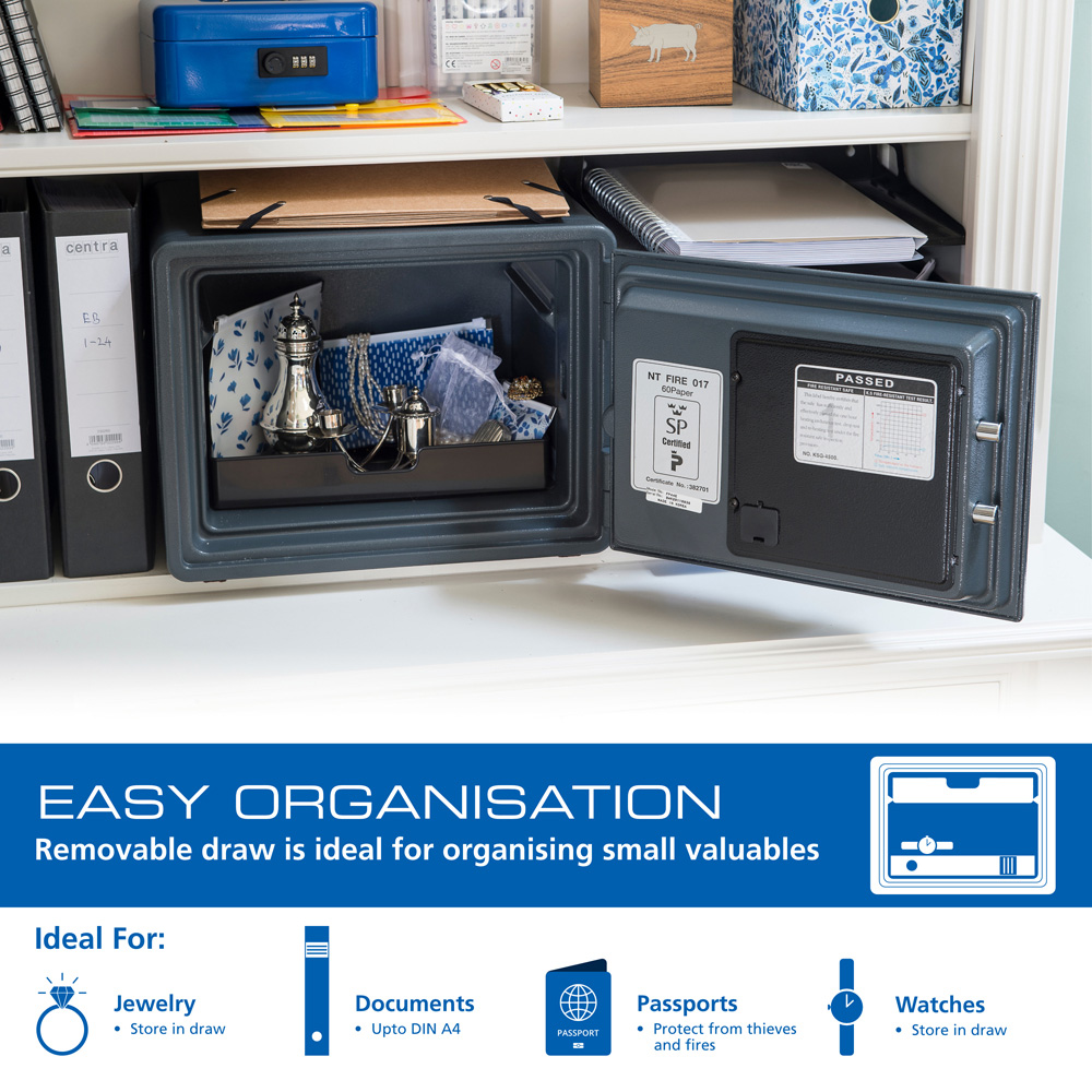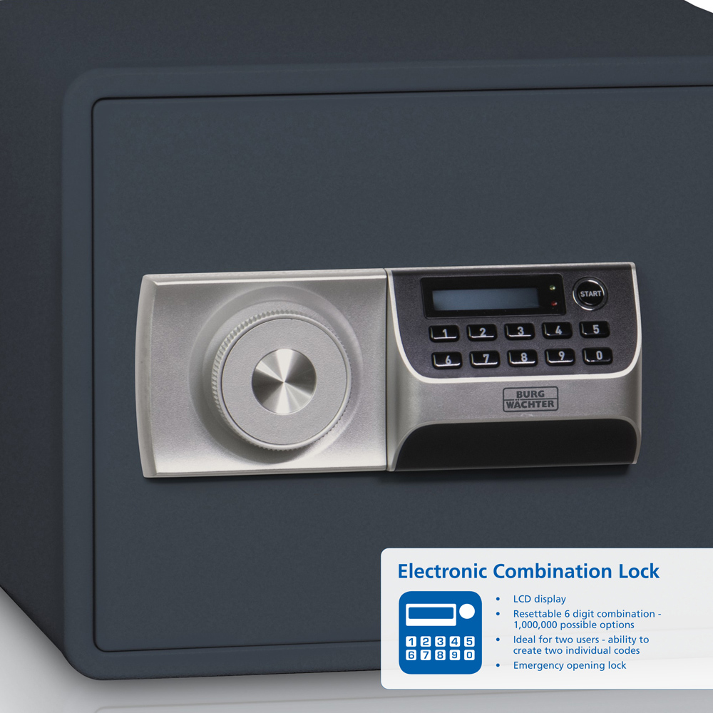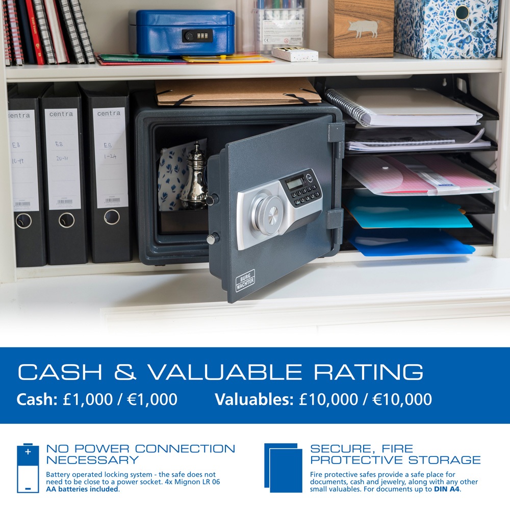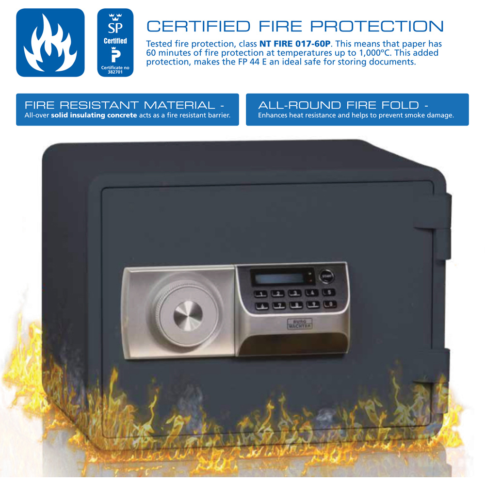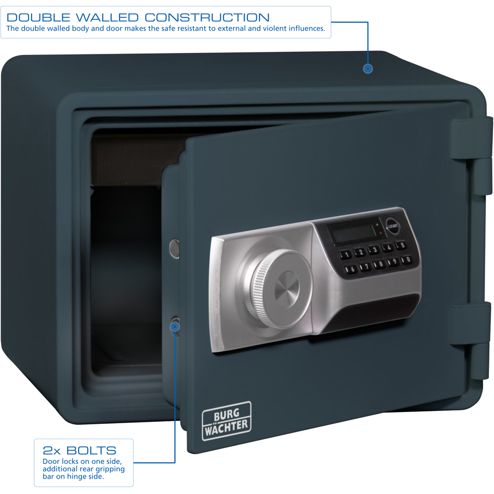 Keep all your important documents and cash safe and secure with Burg Wachter Anthracite Fire Protective Safe. This Burg Wachter fire safe is ideal for the home. The safe is made from a double-walled body and door, all-round fire fold. It offers 60 minutes of fire protection for paper documents and has an insurance rating. It has a digital keypad with an LED display. Prepared for fixing to the floor. Fixing materials included. Tested fire protection, class NT FIRE 017-60P: 60 minutes of fire protection for paper at temperatures up to 1000 °C.