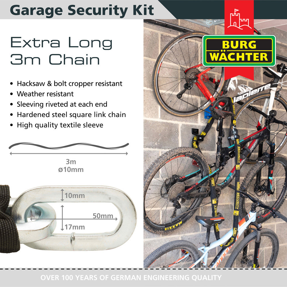 Keep your bikes secure with this Burg-Wachter Garage Security Kit. Most people store valuable equipment such as bicycles, lawnmowers and hedge trimmers in their garages. Thus, it is essential to secure these items to prevent thieves from invading your place. This kit features a three-metre-long security chain to thread through your belongings and a heavy-duty ground anchor with anti-tamper fixings. It also comes with an award-winning u-lock that helps secure everything together and features a PIR motion-sensing alarm to deter thieves. Includes: a heavy-duty ground anchor, extra-long 3m chain, durable U-bolt lock and a PIR alarm.