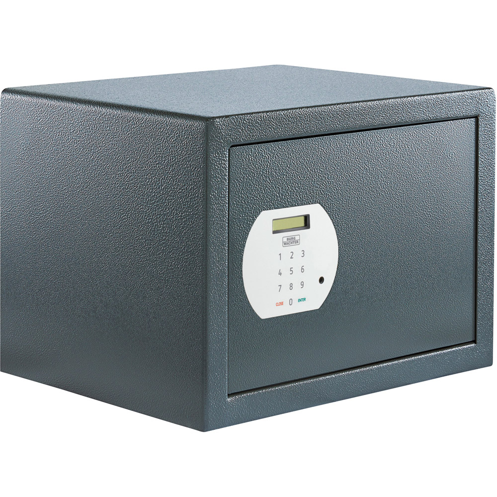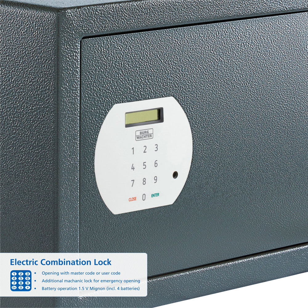 Keep your valuables safe in this Burg-Wachter PS 130 E Pure Safe. This 40.3L compact electronic safe is ideal for home or office use. It makes a secure storage for money, passports, jewellery or important documents. Durable and sturdy, it features a solid walled body and double-walled door to keep your belongings secure. Moreover, the case has an easy-to-read LCD, re-settable combination and touch-sensitive keys. Plus, it comes with a removable shelf and fittings included for wall or floor mounting.