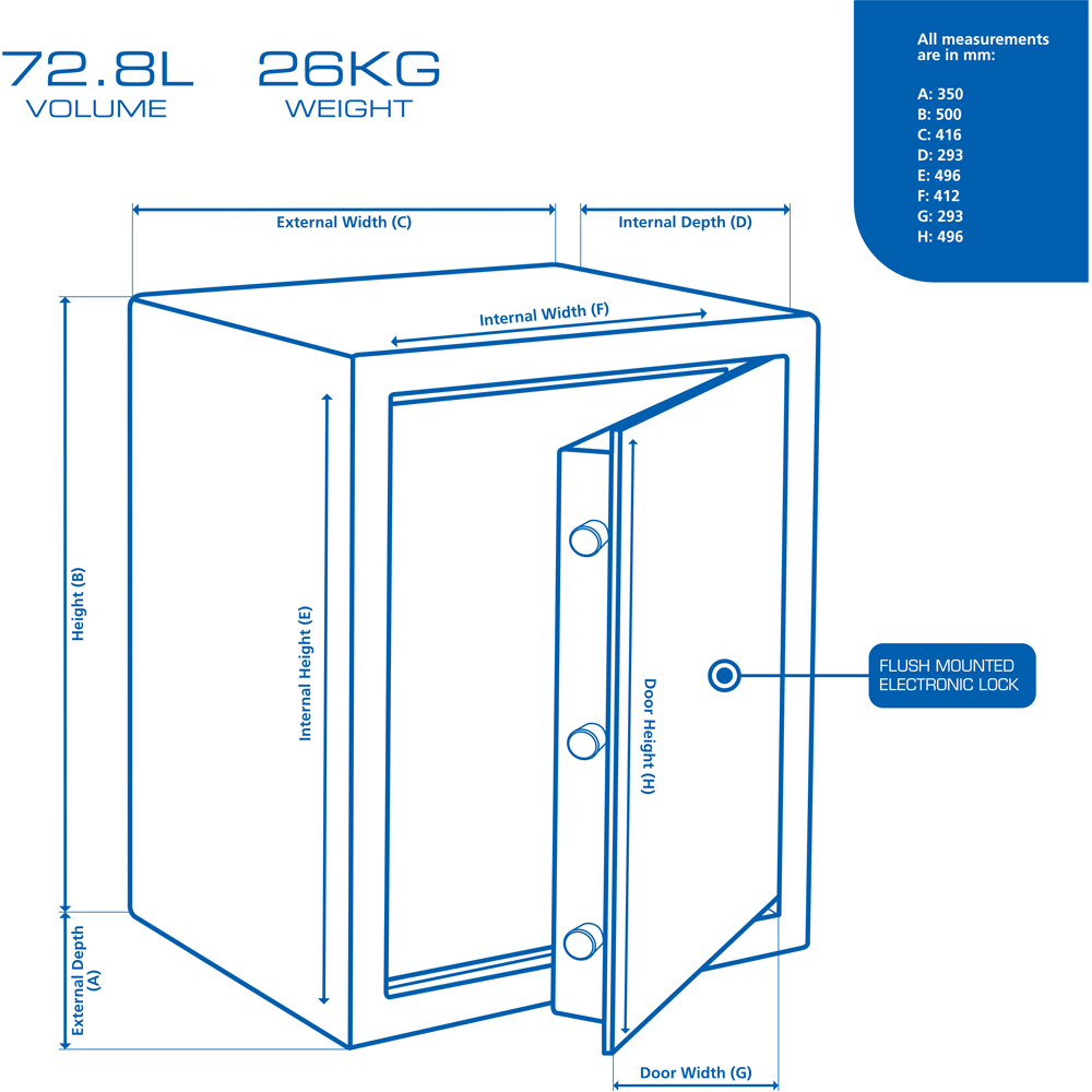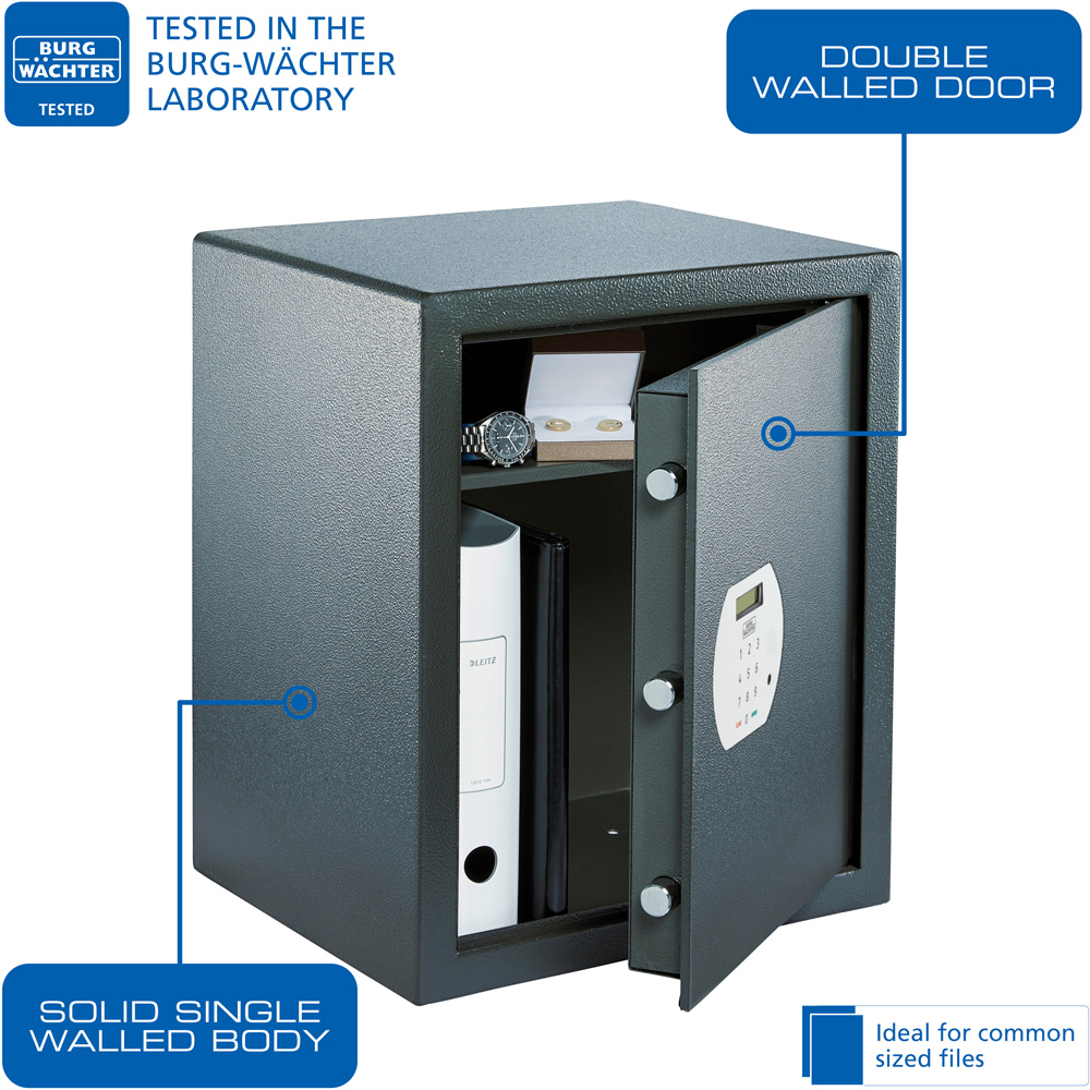 Keep your valuables safe in this Burg-Wachter PS 140 E Pure Safe. This 59.8L compact electronic safe is ideal for home or office use. It makes a secure storage for money, passports, jewellery or important documents. Durable and sturdy, it features a solid walled body and double-walled door to keep your belongings secure. Moreover, the case has an easy-to-read LCD, re-settable combination and touch-sensitive keys. Plus, it comes with a removable shelf and fittings included for wall or floor mounting.