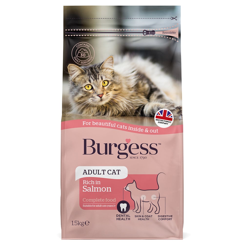 Burgess Adult Rich In Scottish Salmon Dry Cat Food is a complete food suitable for cats from the age of 12 months. This tasty recipe contains everything your cat needs to stay beautiful inside and out. It's formulated with highly digestible proteins to support the natural carnivores that cats are. It also includes dental defence technology which helps to maintain healthy teeth and gums, taurine for a healthy heart, omega fatty acids for healthy skin and coat and natural prebiotics to support your cat's digestion.
