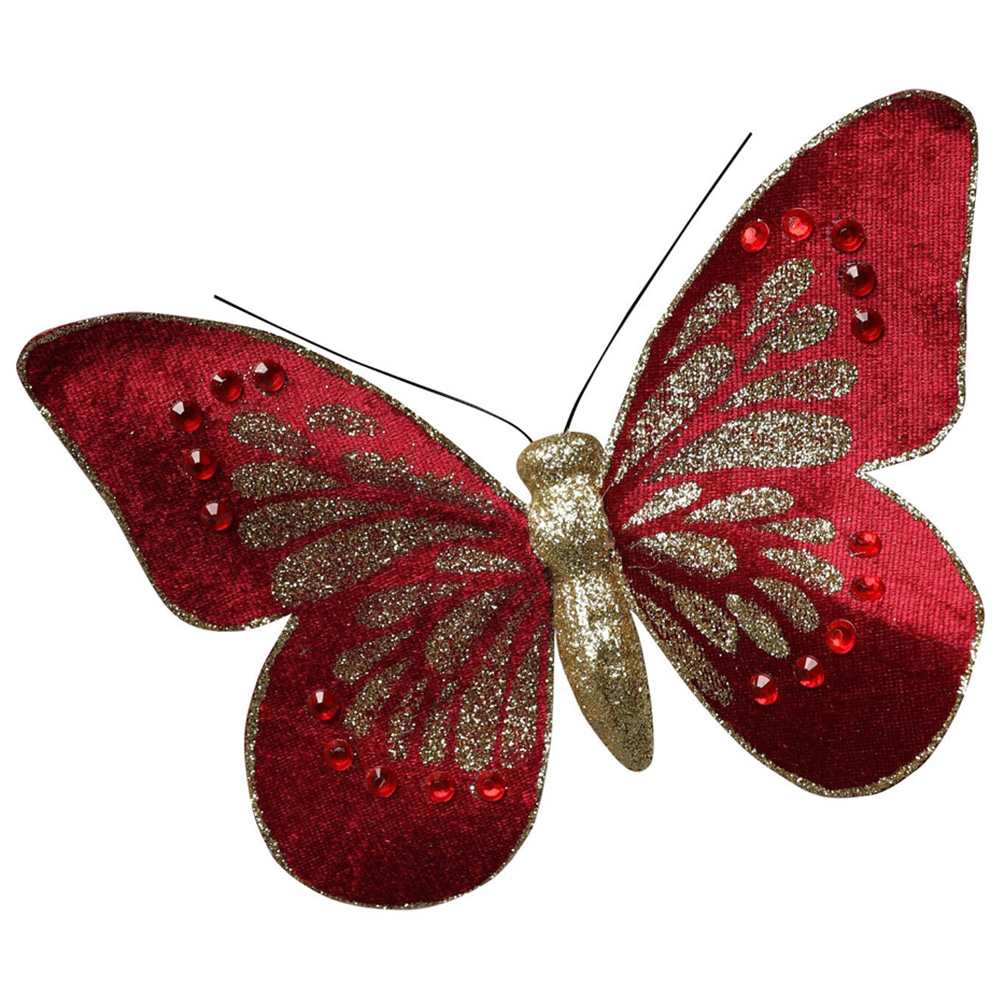 The Burgundy and Gold Butterfly is a unique and beautiful addition to your Christmas tree. This large butterfly has luxurious deep red wings accented with pretty gold glitter and red jewels to help it sparkle and shimmer under the glow of your festive lights. The butterfly will look lovely resting on the branches of your Christmas tree, or anywhere else around your home.