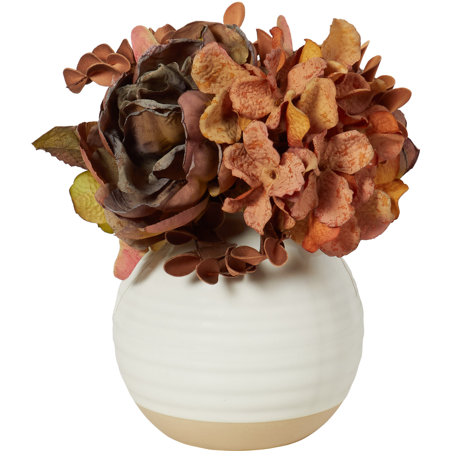 Add a touch of seasonal elegance to your space with the Burnt Orange Hydrangea Vase Arrangement. This striking arrangement features vibrant hydrangeas nestled in a charming ceramic vase. Made from premium plastic, ceramic, and polyester, it offers a lasting and stylish décor solution. Perfect for any room, it brings the beauty of fall indoors with its rich, warm hues and lifelike design.