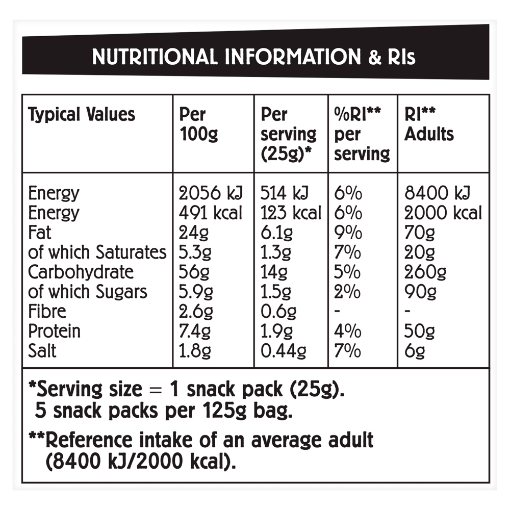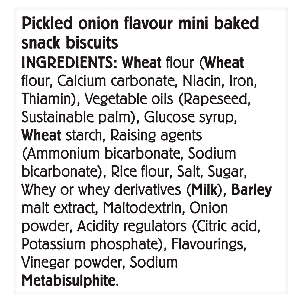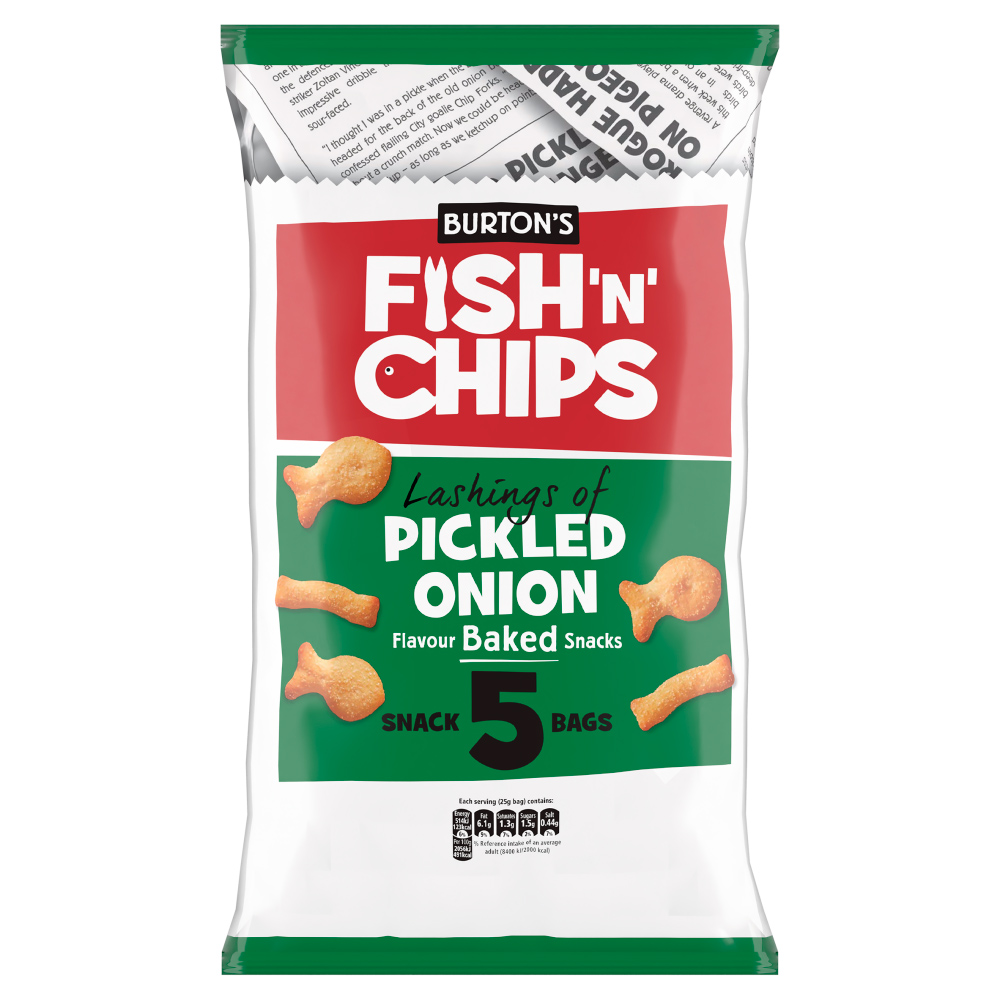 Burton's Fish 'n' Chips Lashings of Pickled Onion Flavour Baked Snacks 5 Snack Bags 125g. L-Carnitine + Taurine + B Vitamins. This product is GMO free. This product is gluten free. This product is allergen free..