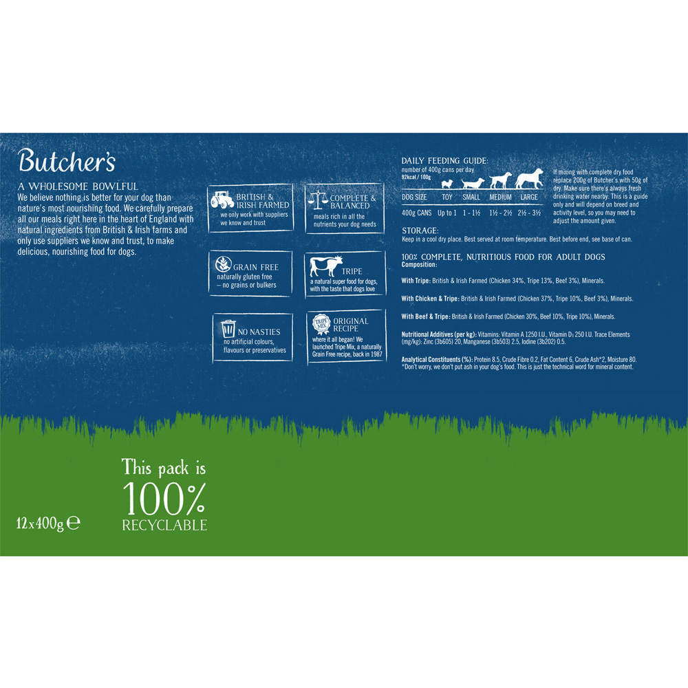 Fuel your dog’s day with the Butchers Tripe Loaf Recipes Wet Dog Food Tins 400g. Made with a hearty tripe blend, this grain-free recipe supports everyday health and vitality. Each tin offers a complete, nourishing meal that’s gentle on digestion and full of flavour. It is perfect for keeping your dog happy and energised.