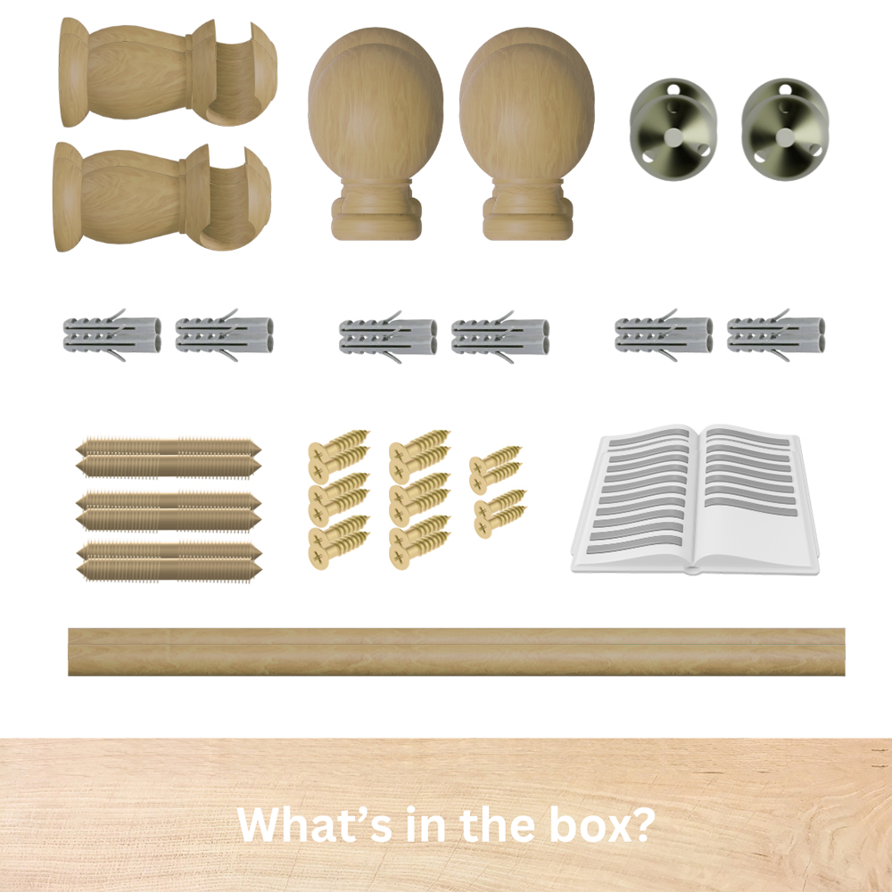 - Includes finials, brackets, instructions, fittings