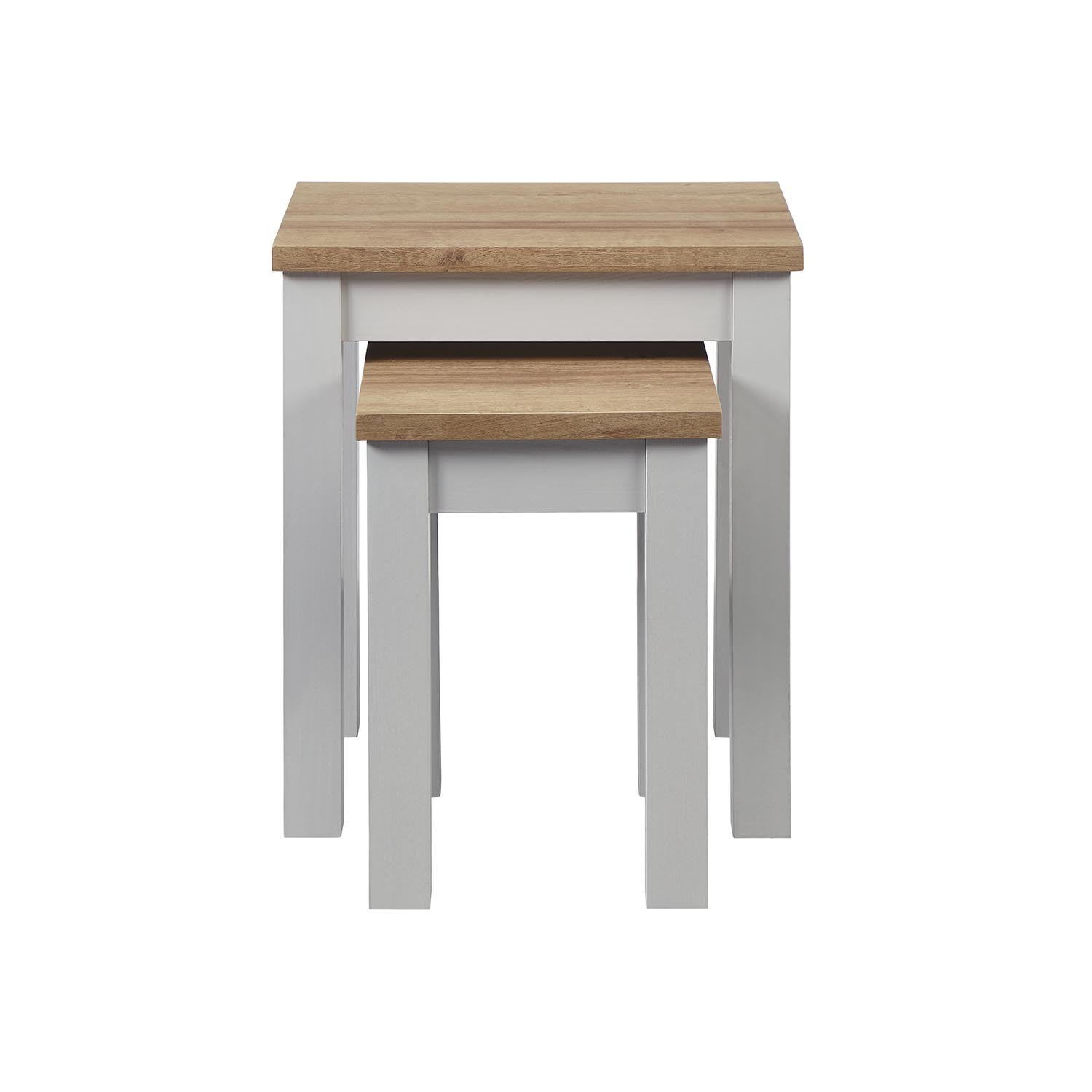 With a modern oak effect finish and contrasting light grey legs, this Cambridge Nest of Tables offers a perfect match for your living room. It's easy to assemble and easy to clean, making it the ideal choice for busy family homes. Helping you make the most of your storage space whilst giving you more surfaces when people come over - ideal for somewhere to pop drinks and nibbles. The gorgeous colour and contemporary design makes this set of tables easy to coordinate with your existing decor and giving your living space a fresher feel.