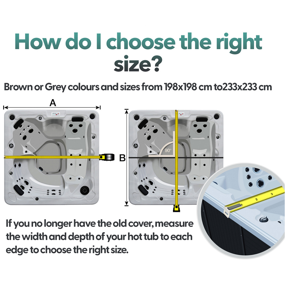 Bid adieu to chilly dips with the Canadian Spa Company Grey Hot Tub Cover. Your hot tub will always remain invitingly warm thanks to the deluxe covers, which seal in the heat. Built to withstand any weather conditions, this cover is like a warm hug for your tub. The cover, which is made from premium materials, withstands sunlight, rain, and snow. Installing the cover is easy and doesn't require much effort. Save time fussing and enjoy more time basking in the positive energy. Your tub will appreciate this hot tub cover. Size: 208 x 208cm.
