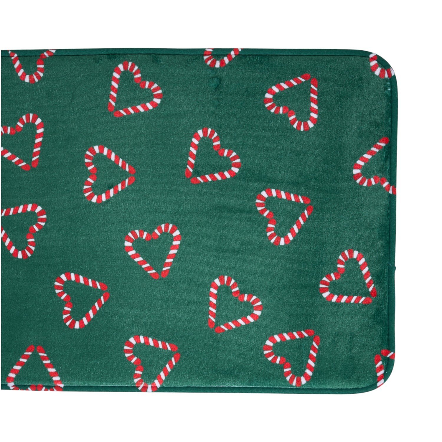 Bring a festive twist to your home with the Candy Cane Heart Bath Mat. Featuring a bright candy cane heart pattern against a deep green background, this bath mat adds a touch of charm to any home this festive season. It's crafted from soft, absorbent material that quickly soaks up water, making it excellent for drying your feet after showering.