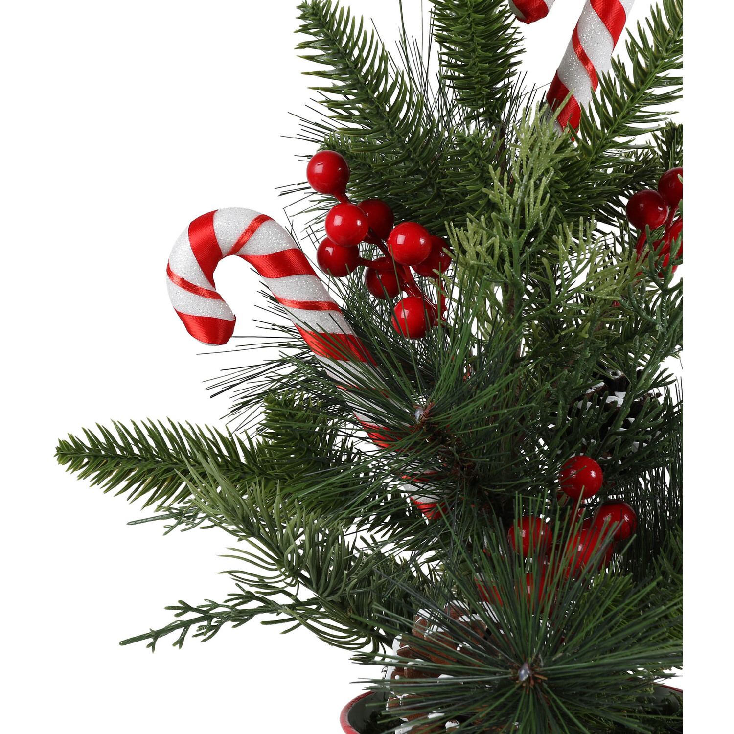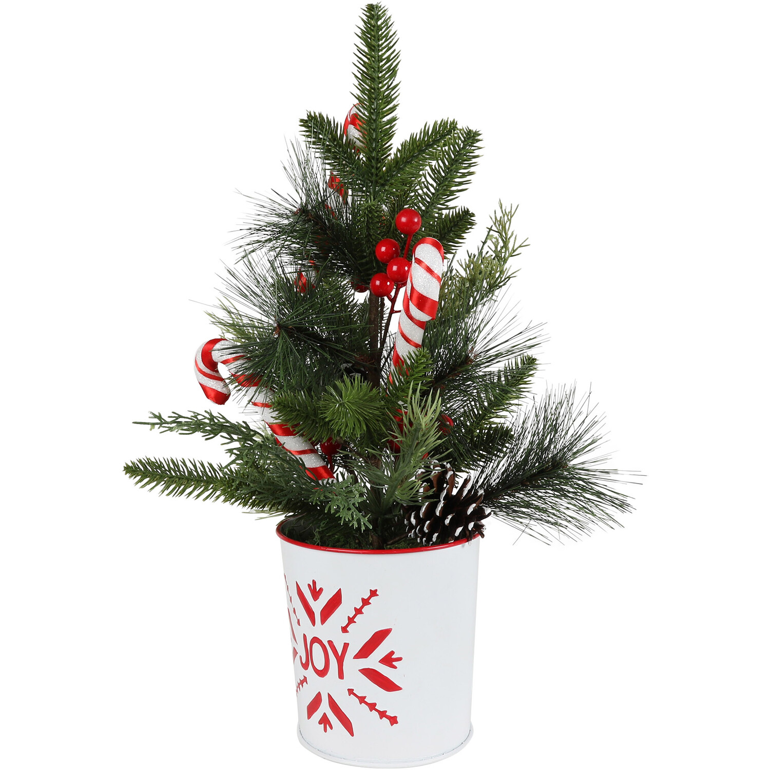 Our Candy Cane Joy Potted Tree is an adorable addition to your Christmas decorating. The traditional mini Christmas tree is set into a white pot inspired by candy canes and finished with the word 'Joy' inside a bright red snowflake. The tree is decorated with candy canes and faux berries, featuring a subtle hint of glitter for a slight shimmer and an extra magical look. It's sure to look fantastic on accent tables, shelves, and mantelpieces around your home.